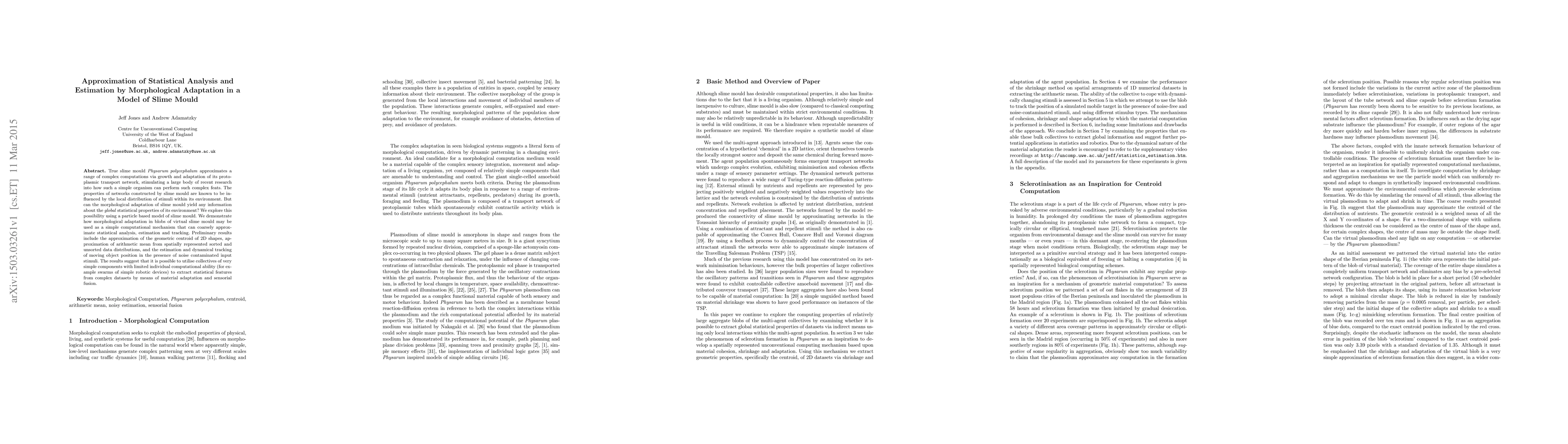 This paper explores how slime mould's morphological adaptation can approximate statistical analysis and estimation. It demonstrates that a simple computational mechanism using virtual slime mould can approximate the geometric centroid, arithmetic mean, and track moving object positions, suggesting potential for extracting statistical features from complex datasets using simple components.