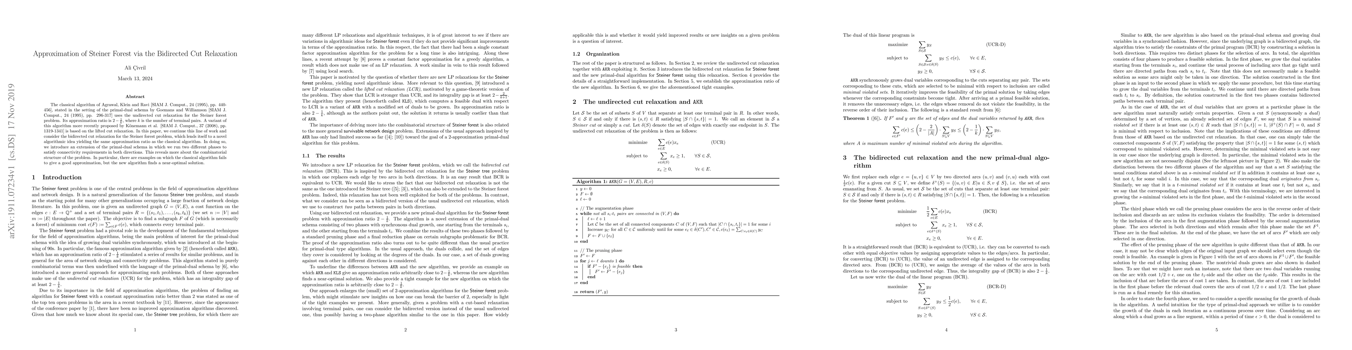 The classical algorithm of Agrawal, Klein and Ravi [SIAM J. Comput., 24 (1995), pp. 440-456], stated in the setting of the primal-dual schema by Goemans and Williamson [SIAM J. Comput., 24 (1995), pp. 296-317] uses the undirected cut relaxation for the Steiner forest problem. Its approximation ratio is $2-\frac{1}{k}$, where $k$ is the number of terminal pairs. A variant of this algorithm more recently proposed by K\"onemann et al. [SIAM J. Comput., 37 (2008), pp. 1319-1341] is based on the lifted cut relaxation. In this paper, we continue this line of work and consider the bidirected cut relaxation for the Steiner forest problem, which lends itself to a novel algorithmic idea yielding the same approximation ratio as the classical algorithm. In doing so, we introduce an extension of the primal-dual schema in which we run two different phases to satisfy connectivity requirements in both directions. This reveals more about the combinatorial structure of the problem. In particular, there are examples on which the classical algorithm fails to give a good approximation, but the new algorithm finds a near-optimal solution.