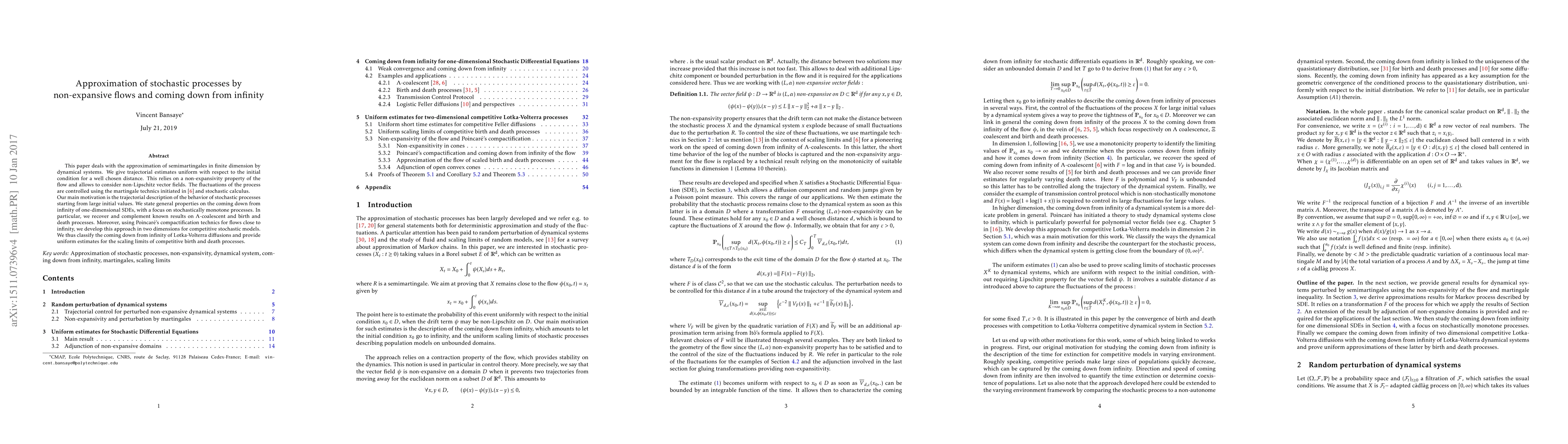 This paper approximates stochastic processes in finite dimensions using non-expansive dynamical systems, providing trajectorial estimates for initial conditions. It employs stochastic calculus and martingale techniques to manage fluctuations, focusing on the short-term behavior of processes starting from large values and classifying the coming down from infinity for one-dimensional SDEs, including stochastically monotone processes.