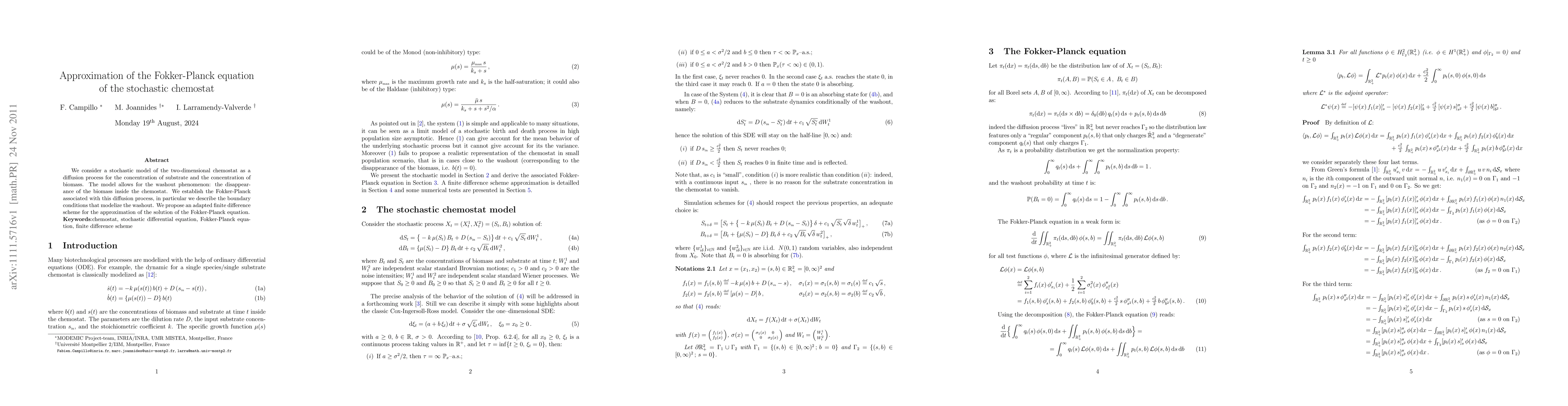 This paper develops a stochastic model for the chemostat, describing the diffusion process for substrate and biomass concentrations, and establishes the corresponding Fokker-Planck equation. It proposes a finite difference scheme for approximating the solution of this equation, particularly focusing on boundary conditions that model the washout phenomenon.