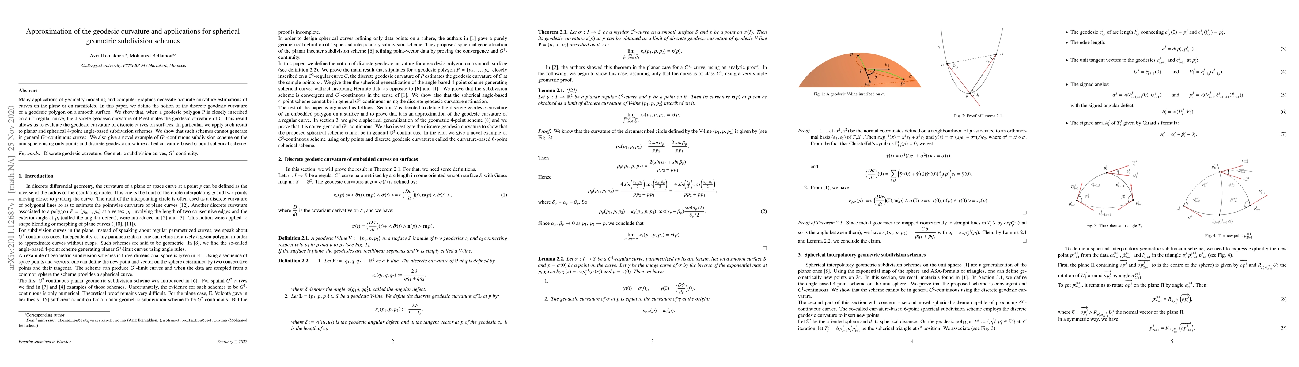 This paper introduces the concept of discrete geodesic curvature for geodesic polygons on smooth surfaces and demonstrates its effectiveness in estimating the true geodesic curvature. It applies this method to spherical geometric subdivision schemes, showing that traditional 4-point angle-based schemes do not achieve $G^2$-continuity, but proposes a novel $G^2$-continuous curvature-based 6-point spherical scheme.