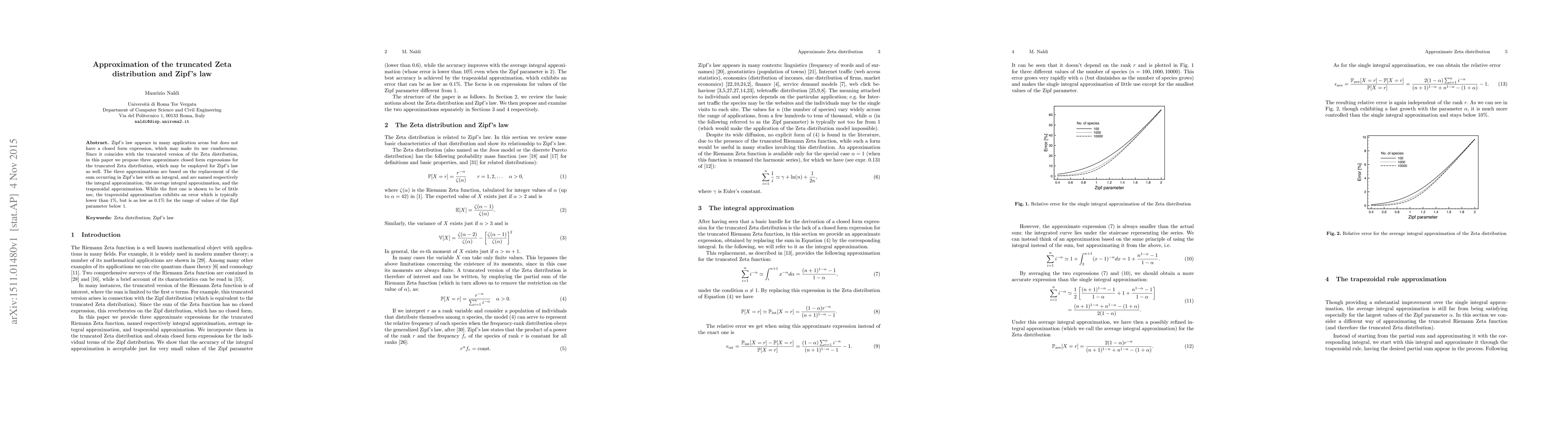 This paper proposes three approximations for the truncated Zeta distribution, which can be used to model Zipf's law with minimal error, especially for values of the Zipf parameter below 1.