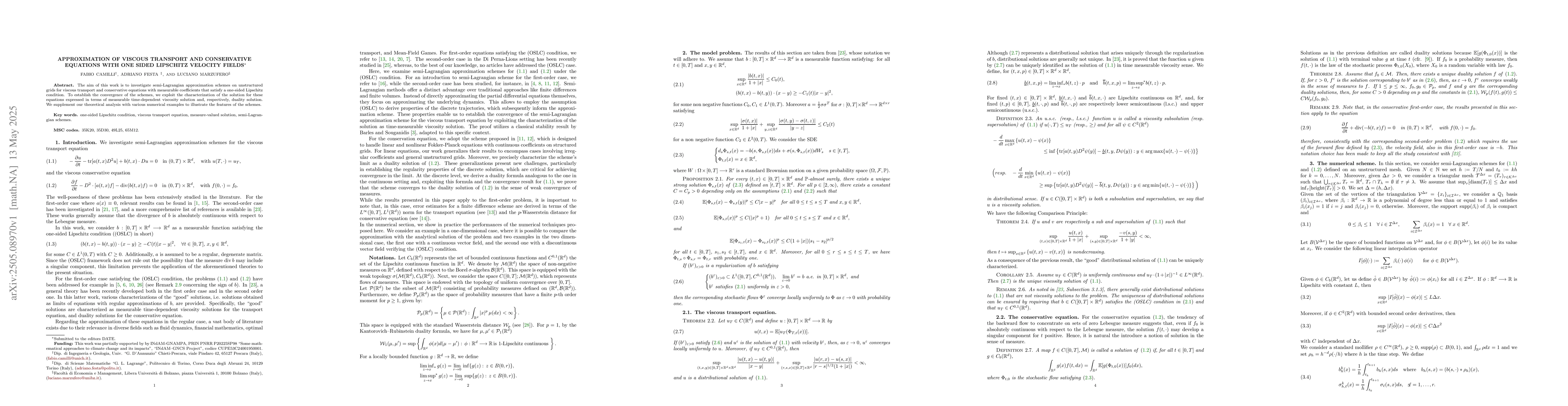 The paper presents a theoretical analysis and numerical examples of semi-Lagrangian approximation schemes for viscous transport and conservative equations under one-sided Lipschitz conditions.