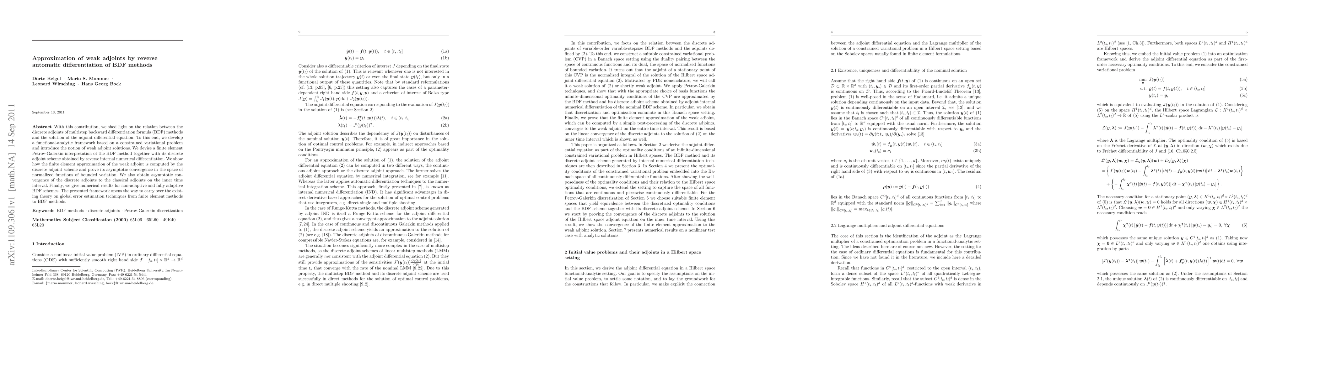 This paper develops a framework for approximating weak adjoints using reverse automatic differentiation of BDF methods, proving their convergence and presenting numerical results for both non-adaptive and adaptive schemes. The study extends global error estimation techniques from finite element methods to BDF methods.
