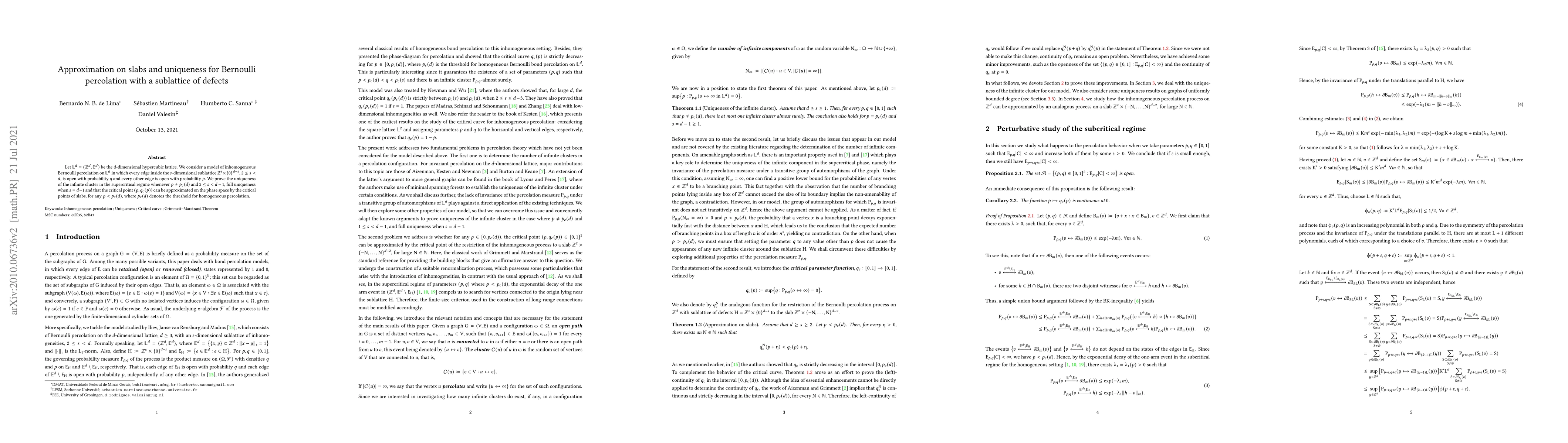 Let $ \mathbb{L}^{d} = ( \mathbb{Z}^{d},\mathbb{E}^{d} ) $ be the $ d $-dimensional hypercubic lattice. We consider a model of inhomogeneous Bernoulli percolation on $ \mathbb{L}^{d} $ in which every edge inside the $ s $-dimensional hyperplane $ \mathbb{Z}^{s} \times \{ 0 \}^{d-s} $, $ 2 \leq s < d $, is open with probability $ q $ and every other edge is open with probability $ p $. We prove the uniqueness of the infinite cluster in the supercritical regime whenever $ p \neq p_{c}(d) $, where $ p_{c}(d) $ denotes the threshold for homogeneous percolation, and that the critical point $ (p,q_{c}(p)) $ can be approximated on the phase space by the critical points of slabs, for any $ p < p_{c}(d) $.