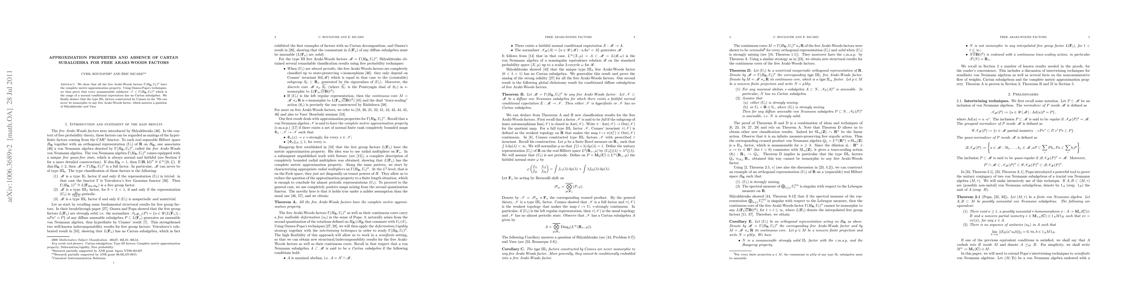 We show that all the free Araki-Woods factors $\Gamma(H_\R, U_t)"$ have the complete metric approximation property. Using Ozawa-Popa's techniques, we then prove that every nonamenable subfactor $\mathcal{N} \subset \Gamma(H_\R, U_t)"$ which is the range of a normal conditional expectation has no Cartan subalgebra. We finally deduce that the type ${\rm III_1}$ factors constructed by Connes in the '70s can never be isomorphic to any free Araki-Woods factor, which answers a question of Shlyakhtenko and Vaes.