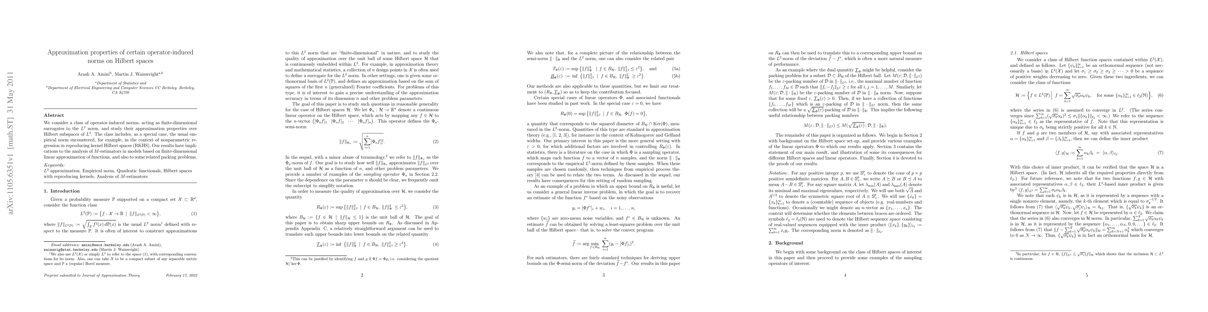 We consider a class of operator-induced norms, acting as finite-dimensional surrogates to the L2 norm, and study their approximation properties over Hilbert subspaces of L2 . The class includes, as a special case, the usual empirical norm encountered, for example, in the context of nonparametric regression in reproducing kernel Hilbert spaces (RKHS). Our results have implications to the analysis of M-estimators in models based on finite-dimensional linear approximation of functions, and also to some related packing problems.