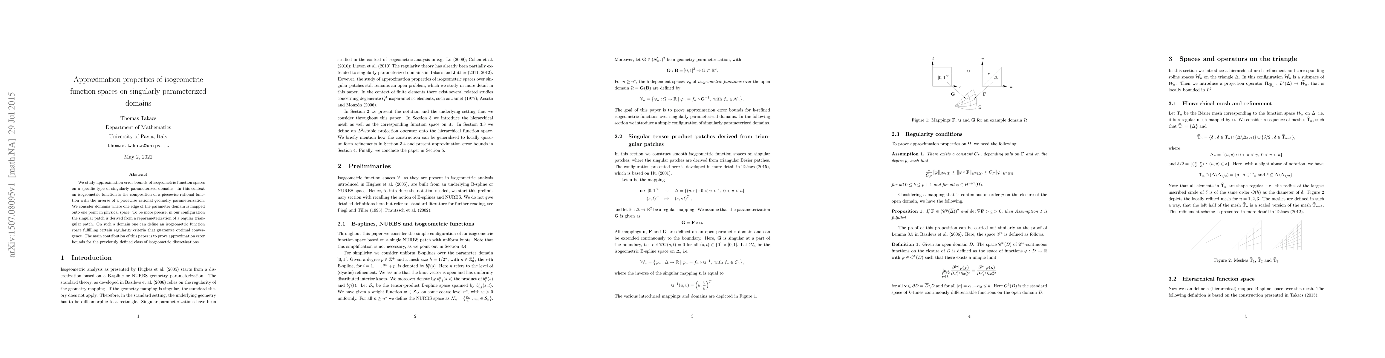 This paper investigates approximation error bounds for isogeometric function spaces on singularly parameterized domains, specifically focusing on domains where one edge maps to a single point in physical space. The study proves optimal convergence properties for these isogeometric discretizations.