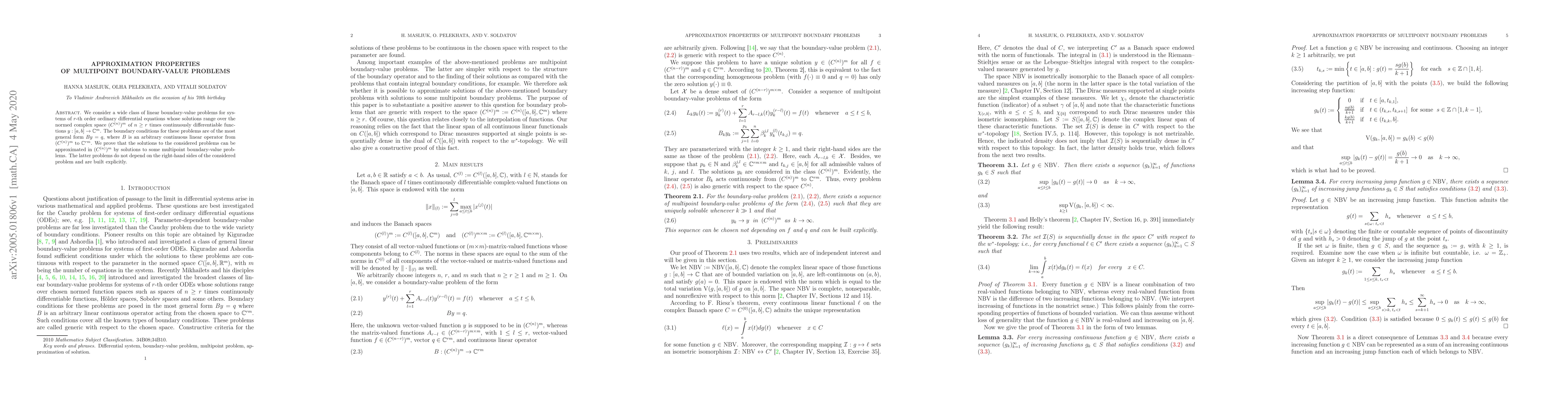 We consider a wide class of linear boundary-value problems for systems of $r$-th order ordinary differential equations whose solutions range over the normed complex space $(C^{(n)})^m$ of $n\geq r$ times continuously differentiable functions $y:[a,b]\to\mathbb{C}^{m}$. The boundary conditions for these problems are of the most general form $By=q$, where $B$ is an arbitrary continuous linear operator from $(C^{(n)})^{m}$ to $\mathbb{C}^{rm}$. We prove that the solutions to the considered problems can be approximated in $(C^{(n)})^m$ by solutions to some multipoint boundary-value problems. The latter problems do not depend on the right-hand sides of the considered problem and are built explicitly.