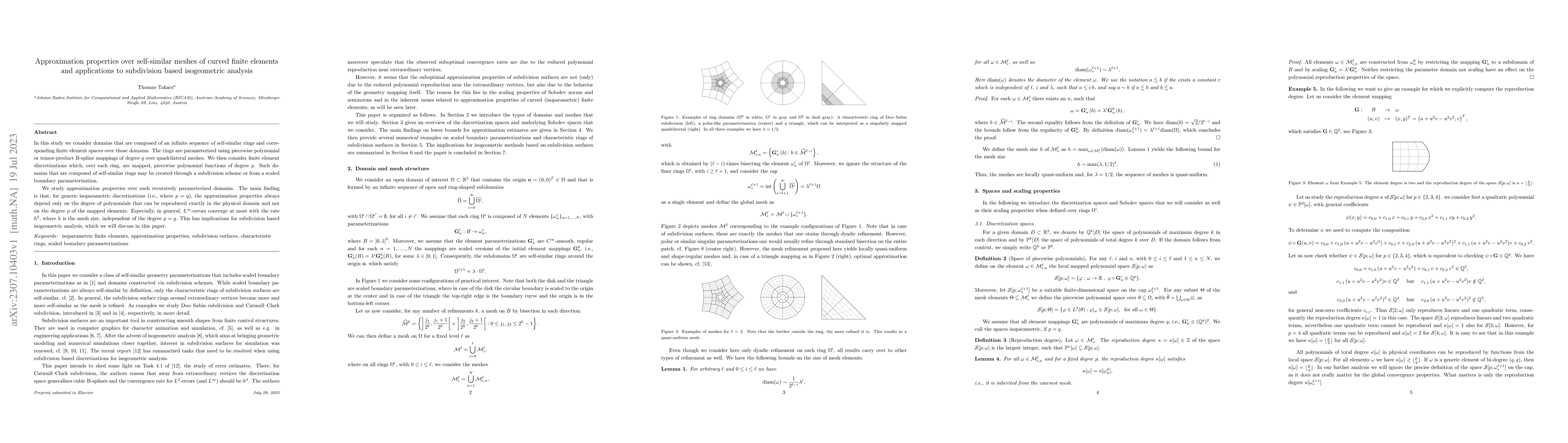 In this study we consider domains that are composed of an infinite sequence of self-similar rings and corresponding finite element spaces over those domains. The rings are parameterized using piecewise polynomial or tensor-product B-spline mappings of degree $q$ over quadrilateral meshes. We then consider finite element discretizations which, over each ring, are mapped, piecewise polynomial functions of degree $p$. Such domains that are composed of self-similar rings may be created through a subdivision scheme or from a scaled boundary parameterization. We study approximation properties over such recursively parameterized domains. The main finding is that, for generic isoparametric discretizations (i.e., where $p=q$), the approximation properties always depend only on the degree of polynomials that can be reproduced exactly in the physical domain and not on the degree $p$ of the mapped elements. Especially, in general, $L^\infty$-errors converge at most with the rate $h^2$, where $h$ is the mesh size, independent of the degree $p=q$. This has implications for subdivision based isogeometric analysis, which we will discuss in this paper.