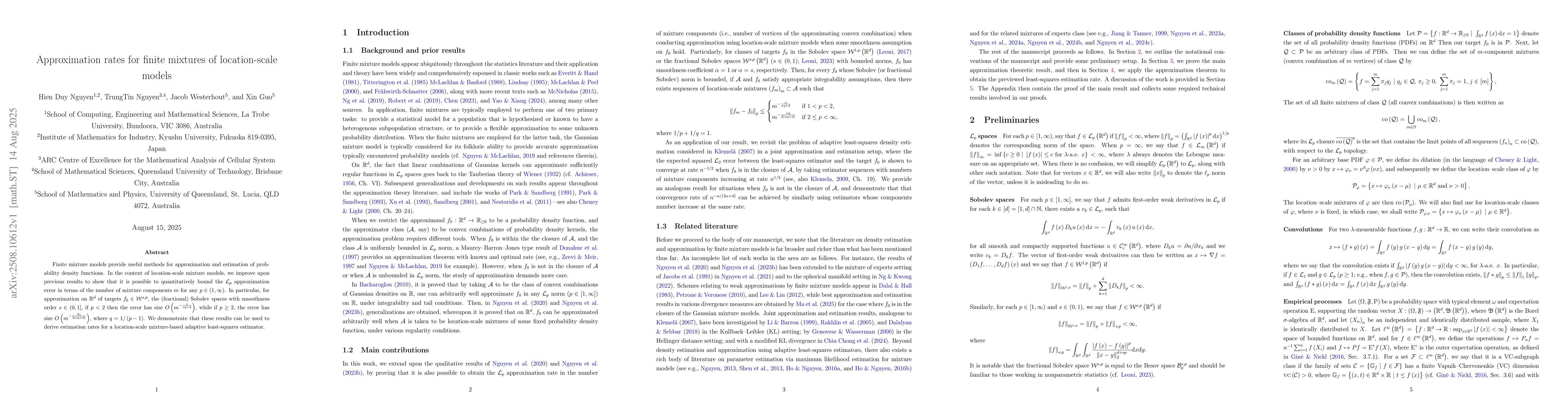 Finite mixture models provide useful methods for approximation and estimation of probability density functions. In the context of location-scale mixture models, we improve upon previous results to show that it is possible to quantitatively bound the ${\cal L}_{p}$ approximation error in terms of the number of mixture components $m$ for any $p\in\left(1,\infty\right)$. In particular, for approximation on $\mathbb{R}^{d}$ of targets $f_{0}\in{\cal W}^{s,p}$, the (fractional) Sobolev spaces with smoothness order $s\in\left(0,1\right]$, if $p<2$ then the error has size $O\left(m^{-\frac{s}{sq+d}}\right)$, while if $p\ge2$, the error has size $O\left(m^{-\frac{2s}{2\left(sq+d\right)}}\right)$, where $q=1/\left(p-1\right)$. We demonstrate that these results can be used to derive estimation rates for a location-scale mixture-based adaptive least-squares estimator.