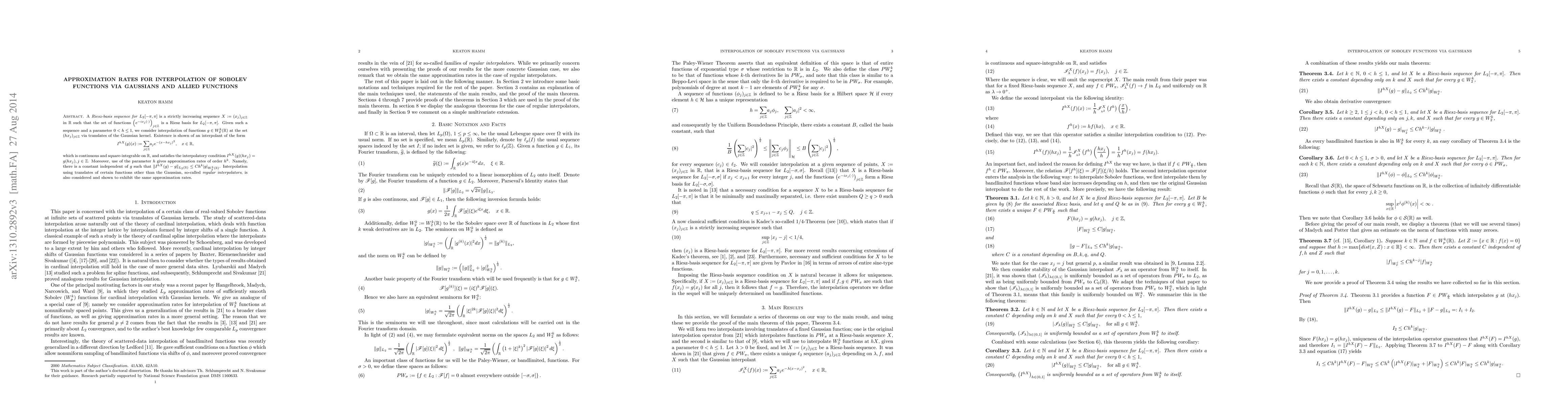 This paper investigates the interpolation of Sobolev functions using Gaussian kernels and other regular interpolators, demonstrating the existence of interpolants that satisfy the interpolatory condition and achieve approximation rates of order $h^k$. The study shows that these interpolants are continuous and square-integrable, with error bounds dependent on the Sobolev norm of the function being interpolated.