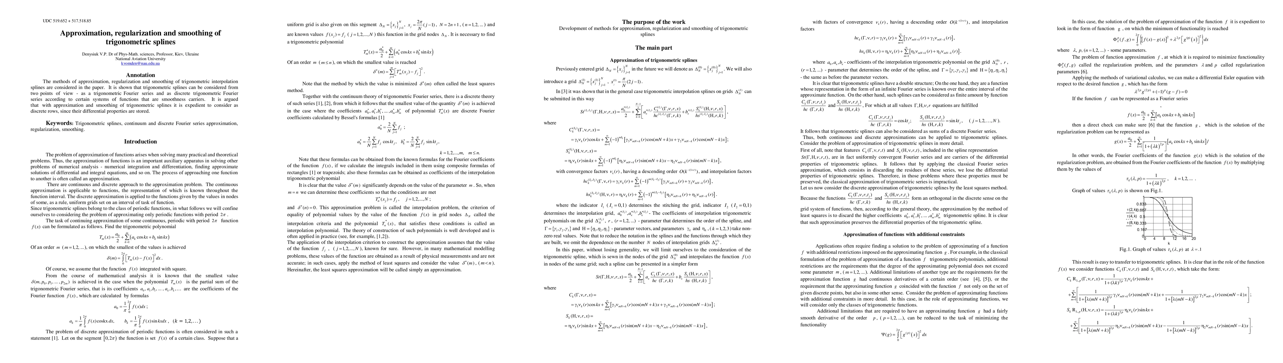 This paper explores the approximation, regularization, and smoothing of trigonometric interpolation splines, presenting them both as trigonometric Fourier series and discrete Fourier series based on smoothness-carrying function systems. It emphasizes the importance of treating these splines as discrete rows for maintaining their differential properties during approximation and smoothing.