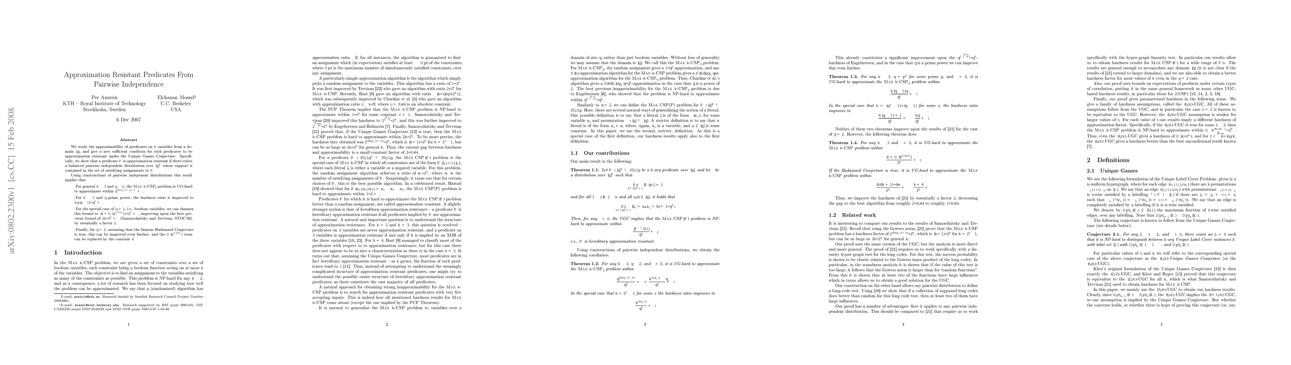 This paper presents a new sufficient condition for predicates on $k$ variables to be approximation resistant under the Unique Games Conjecture, showing that such predicates exist if there is a balanced pairwise independent distribution over the satisfying assignments of $P$.