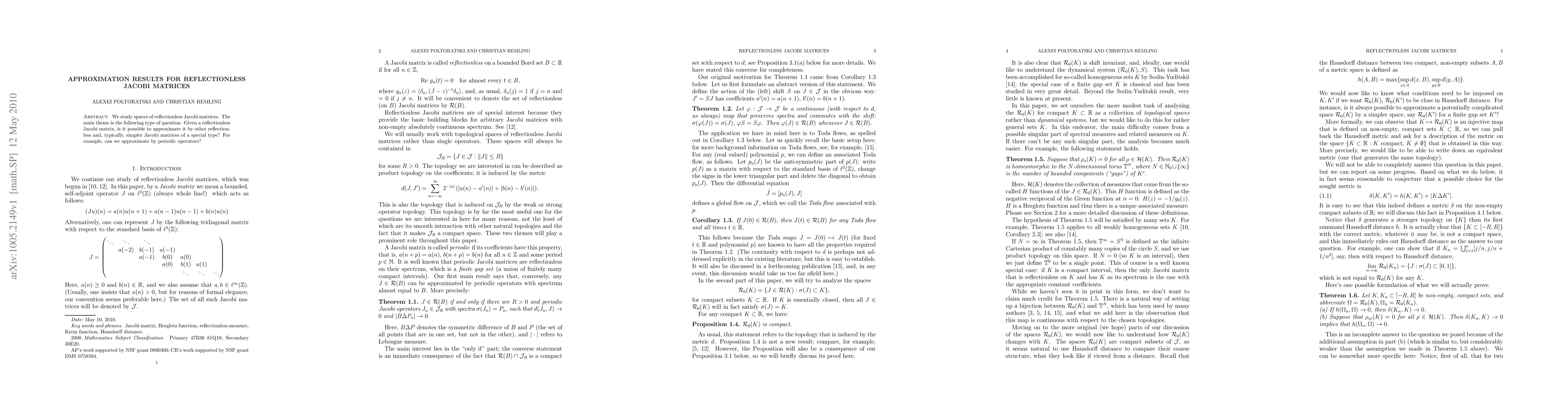 We study spaces of reflectionless Jacobi matrices. The main theme is the following type of question: Given a reflectionless Jacobi matrix, is it possible to approximate it by other reflectionless and, typically, simpler Jacobi matrices of a special type? For example, can we approximate by periodic operators?