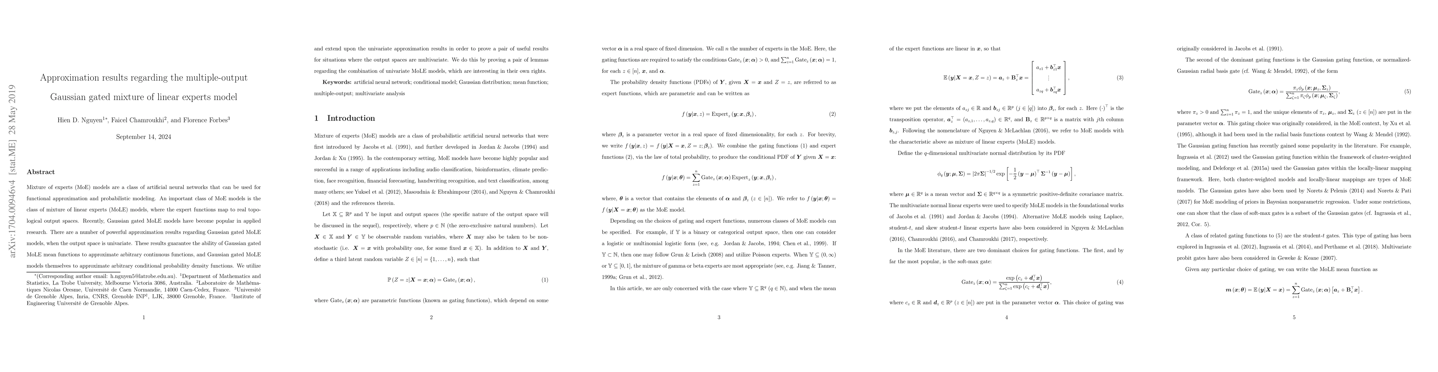 This paper extends univariate approximation results for mixture of linear experts (MoLE) models to multivariate output spaces, proving their ability to approximate arbitrary continuous functions and conditional probability density functions in multiple dimensions. The findings enhance the utility of MoLE models for complex functional approximation and probabilistic modeling.
