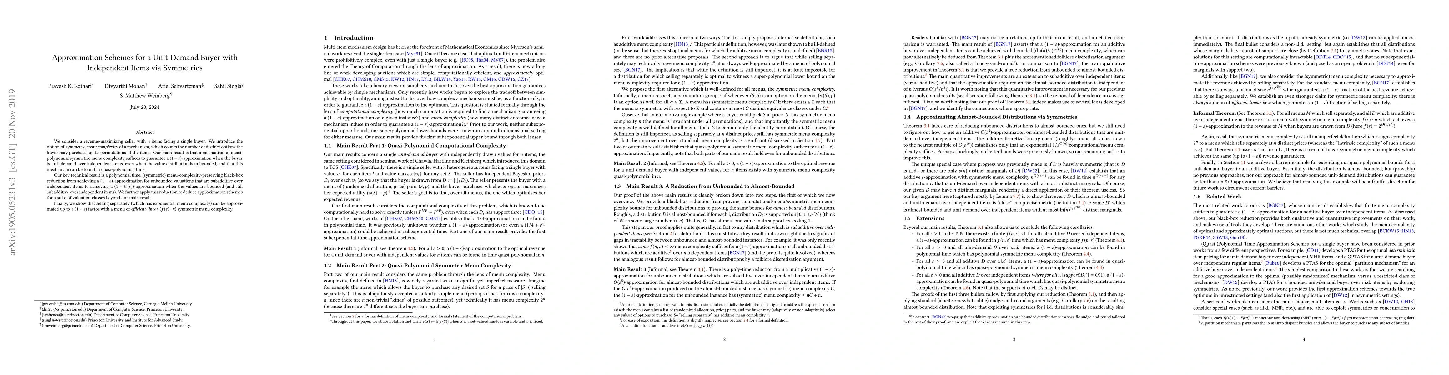We consider a revenue-maximizing seller with $n$ items facing a single buyer. We introduce the notion of symmetric menu complexity of a mechanism, which counts the number of distinct options the buyer may purchase, up to permutations of the items. Our main result is that a mechanism of quasi-polynomial symmetric menu complexity suffices to guarantee a $(1-\varepsilon)$-approximation when the buyer is unit-demand over independent items, even when the value distribution is unbounded, and that this mechanism can be found in quasi-polynomial time. Our key technical result is a polynomial time, (symmetric) menu-complexity-preserving black-box reduction from achieving a $(1-\varepsilon)$-approximation for unbounded valuations that are subadditive over independent items to achieving a $(1-O(\varepsilon))$-approximation when the values are bounded (and still subadditive over independent items). We further apply this reduction to deduce approximation schemes for a suite of valuation classes beyond our main result. Finally, we show that selling separately (which has exponential menu complexity) can be approximated up to a $(1-\varepsilon)$ factor with a menu of efficient-linear $(f(\varepsilon) \cdot n)$ symmetric menu complexity.