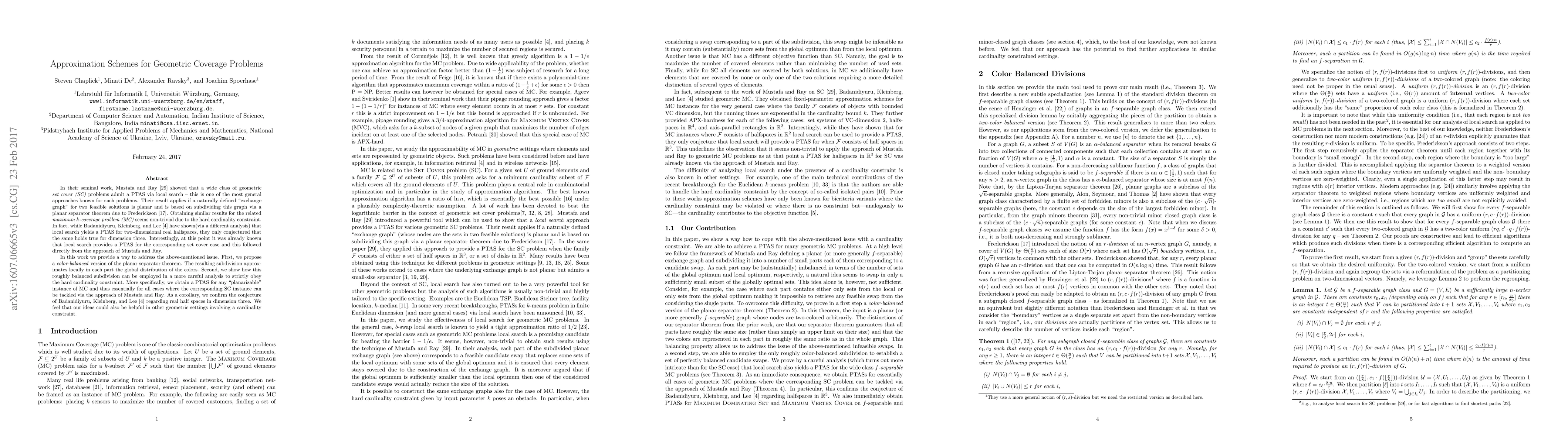 In their seminal work, Mustafa and Ray (2009) showed that a wide class of geometric set cover (SC) problems admit a PTAS via local search -- this is one of the most general approaches known for such problems. Their result applies if a naturally defined "exchange graph" for two feasible solutions is planar and is based on subdividing this graph via a planar separator theorem due to Frederickson (1987). Obtaining similar results for the related maximum k-coverage problem (MC) seems non-trivial due to the hard cardinality constraint. In fact, while Badanidiyuru, Kleinberg, and Lee (2012) have shown (via a different analysis) that local search yields a PTAS for two-dimensional real halfspaces, they only conjectured that the same holds true for dimension three. Interestingly, at this point it was already known that local search provides a PTAS for the corresponding set cover case and this followed directly from the approach of Mustafa and Ray. In this work we provide a way to address the above-mentioned issue. First, we propose a color-balanced version of the planar separator theorem. The resulting subdivision approximates locally in each part the global distribution of the colors. Second, we show how this roughly balanced subdivision can be employed in a more careful analysis to strictly obey the hard cardinality constraint. More specifically, we obtain a PTAS for any "planarizable" instance of MC and thus essentially for all cases where the corresponding SC instance can be tackled via the approach of Mustafa and Ray. As a corollary, we confirm the conjecture of Badanidiyuru, Kleinberg, and Lee regarding real half spaces in dimension three. We feel that our ideas could also be helpful in other geometric settings involving a cardinality constraint.