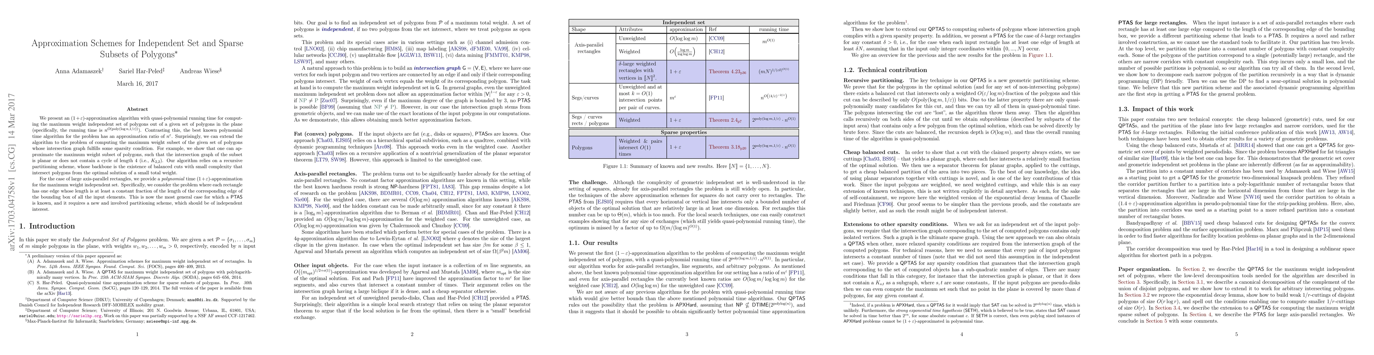 We present an $(1+\varepsilon)$-approximation algorithm with quasi-polynomial running time for computing the maximum weight independent set of polygons out of a given set of polygons in the plane (specifically, the running time is $n^{O( \mathrm{poly}( \log n, 1/\varepsilon))}$). Contrasting this, the best known polynomial time algorithm for the problem has an approximation ratio of~$n^{\varepsilon}$. Surprisingly, we can extend the algorithm to the problem of computing the maximum weight subset of the given set of polygons whose intersection graph fulfills some sparsity condition. For example, we show that one can approximate the maximum weight subset of polygons, such that the intersection graph of the subset is planar or does not contain a cycle of length $4$ (i.e., $K_{2,2}$). Our algorithm relies on a recursive partitioning scheme, whose backbone is the existence of balanced cuts with small complexity that intersect polygons from the optimal solution of a small total weight. For the case of large axis-parallel rectangles, we provide a polynomial time $(1+\varepsilon)$-approximation for the maximum weight independent set. Specifically, we consider the problem where each rectangle has one edge whose length is at least a constant fraction of the length of the corresponding edge of the bounding box of all the input elements. This is now the most general case for which a PTAS is known, and it requires a new and involved partitioning scheme, which should be of independent interest.