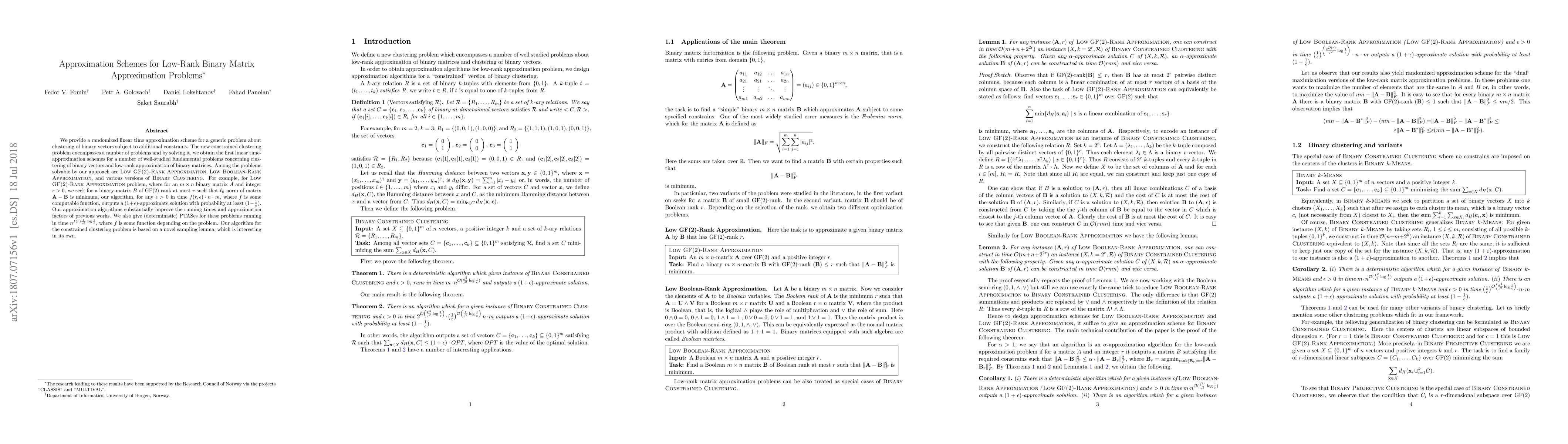 We provide a randomized linear time approximation scheme for a generic problem about clustering of binary vectors subject to additional constrains. The new constrained clustering problem encompasses a number of problems and by solving it, we obtain the first linear time-approximation schemes for a number of well-studied fundamental problems concerning clustering of binary vectors and low-rank approximation of binary matrices. Among the problems solvable by our approach are \textsc{Low GF(2)-Rank Approximation}, \textsc{Low Boolean-Rank Approximation}, and various versions of \textsc{Binary Clustering}. For example, for \textsc{Low GF(2)-Rank Approximation} problem, where for an $m\times n$ binary matrix $A$ and integer $r>0$, we seek for a binary matrix $B$ of $GF_2$ rank at most $r$ such that $\ell_0$ norm of matrix $A-B$ is minimum, our algorithm, for any $\epsilon>0$ in time $ f(r,\epsilon)\cdot n\cdot m$, where $f$ is some computable function, outputs a $(1+\epsilon)$-approximate solution with probability at least $(1-\frac{1}{e})$. Our approximation algorithms substantially improve the running times and approximation factors of previous works. We also give (deterministic) PTASes for these problems running in time $n^{f(r)\frac{1}{\epsilon^2}\log \frac{1}{\epsilon}}$, where $f$ is some function depending on the problem. Our algorithm for the constrained clustering problem is based on a novel sampling lemma, which is interesting in its own.