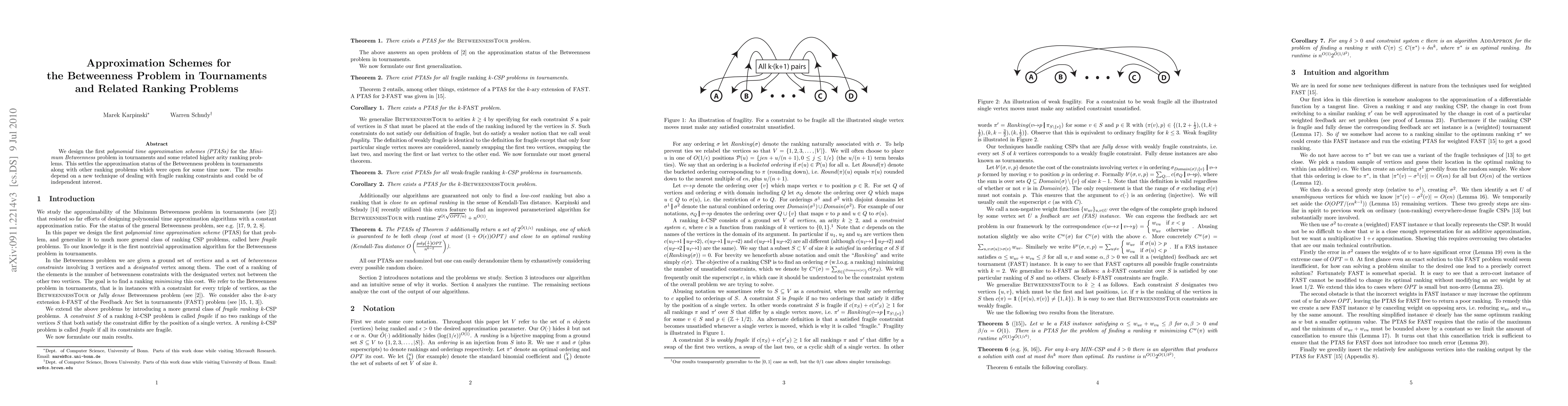 This paper presents the first polynomial time approximation schemes (PTASs) for the Minimum Betweenness problem in tournaments and related ranking problems, resolving their approximation status. The approach introduces a novel technique for handling fragile ranking constraints.