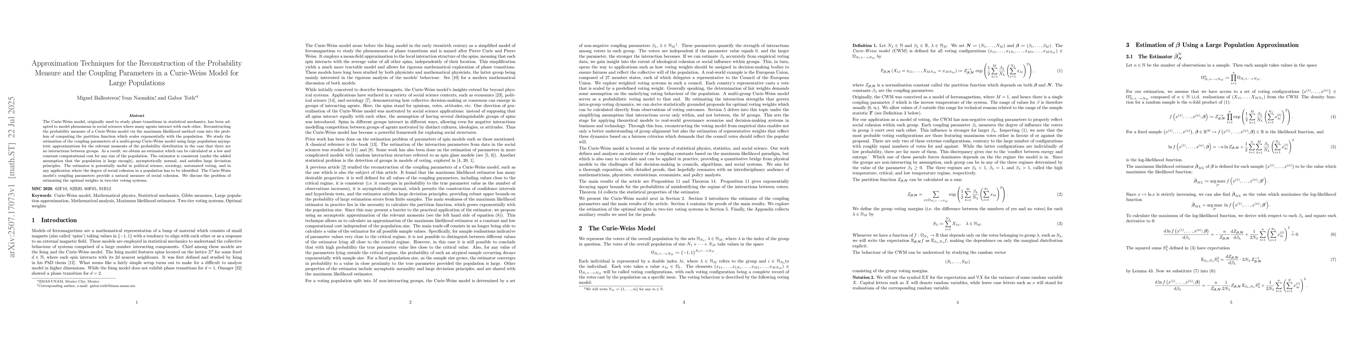 The Curie-Weiss model, originally used to study phase transitions in statistical mechanics, has been adapted to model phenomena in social sciences where many agents interact with each other. Reconstructing the probability measure of a Curie-Weiss model via the maximum likelihood method runs into the problem of computing the partition function which scales exponentially with the population. We study the estimation of the coupling parameters of a multi-group Curie-Weiss model using large population asymptotic approximations for the relevant moments of the probability distribution in the case that there are no interactions between groups. As a result, we obtain an estimator which can be calculated at a low and constant computational cost for any size of the population. The estimator is consistent (under the added assumption that the population is large enough), asymptotically normal, and satisfies large deviation principles. The estimator is potentially useful in political science, sociology, automated voting, and in any application where the degree of social cohesion in a population has to be identified. The Curie-Weiss model's coupling parameters provide a natural measure of social cohesion. We discuss the problem of estimating the optimal weights in two-tier voting systems.