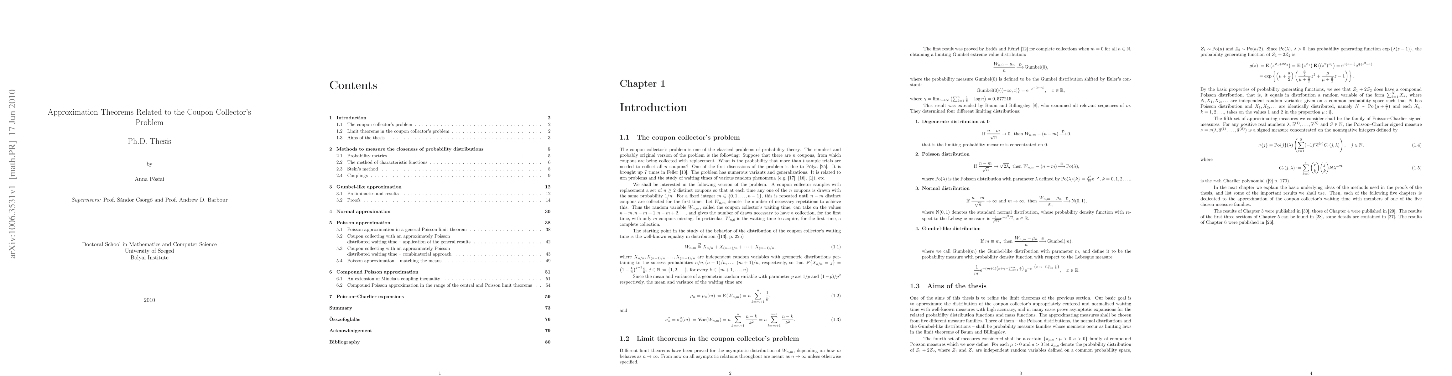 This research explores the classical coupon collector's problem with sampling replacement, focusing on the waiting time $W_{n,m}$ to acquire $n-m$ distinct coupons. The thesis aims to accurately approximate the distribution of this waiting time using five different measure families, including Poisson, normal, Gumbel-like distributions, and compound Poisson distributions.