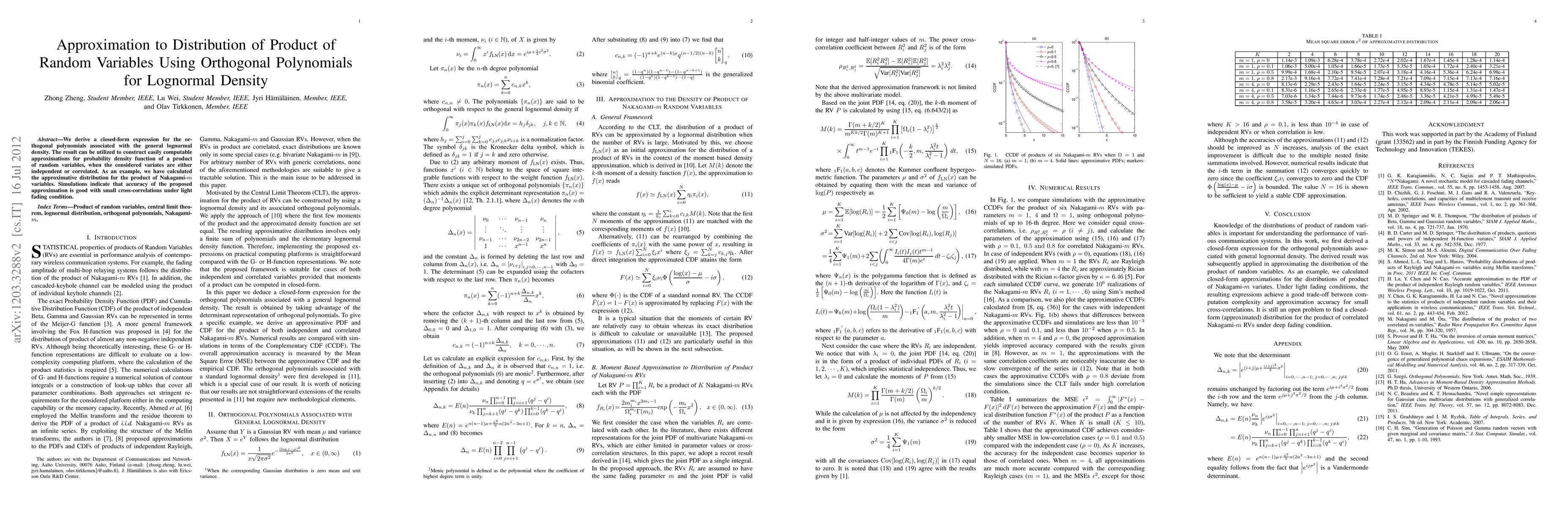 This paper presents a closed-form expression for orthogonal polynomials related to the lognormal density, enabling approximations for the probability density function of a product of random variables, applicable to both independent and correlated cases. The method is demonstrated with the product of Nakagami-m variables, showing good accuracy in simulations under light fading conditions.