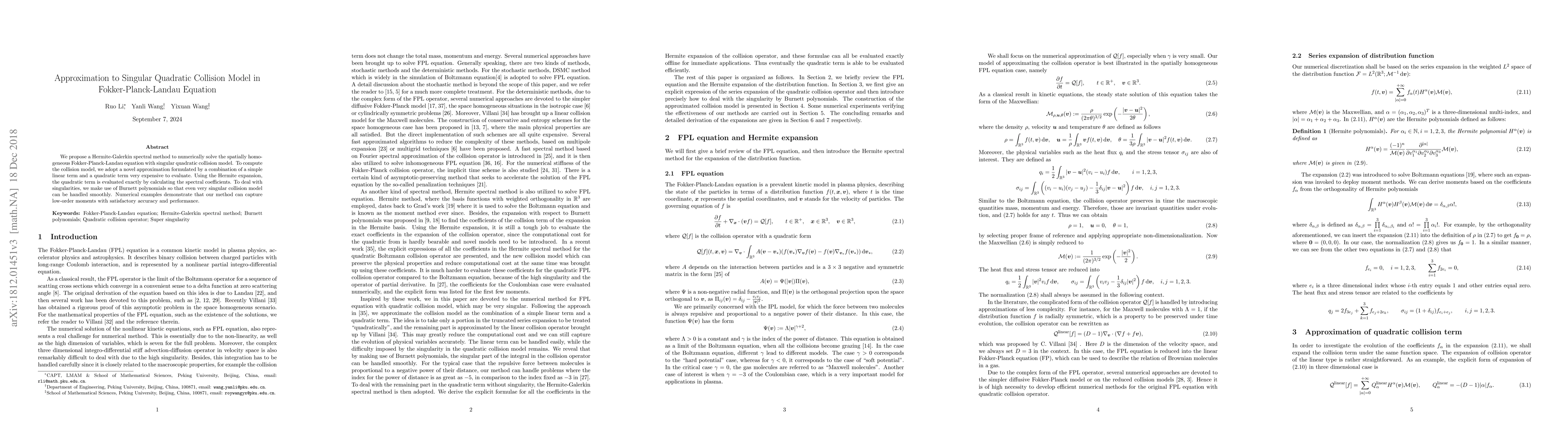 This paper proposes a Hermite-Galerkin spectral method to solve the Fokker-Planck-Landau equation with a singular quadratic collision model. The method uses Burnett polynomials to handle singularities and accurately computes a costly quadratic term via spectral coefficients.