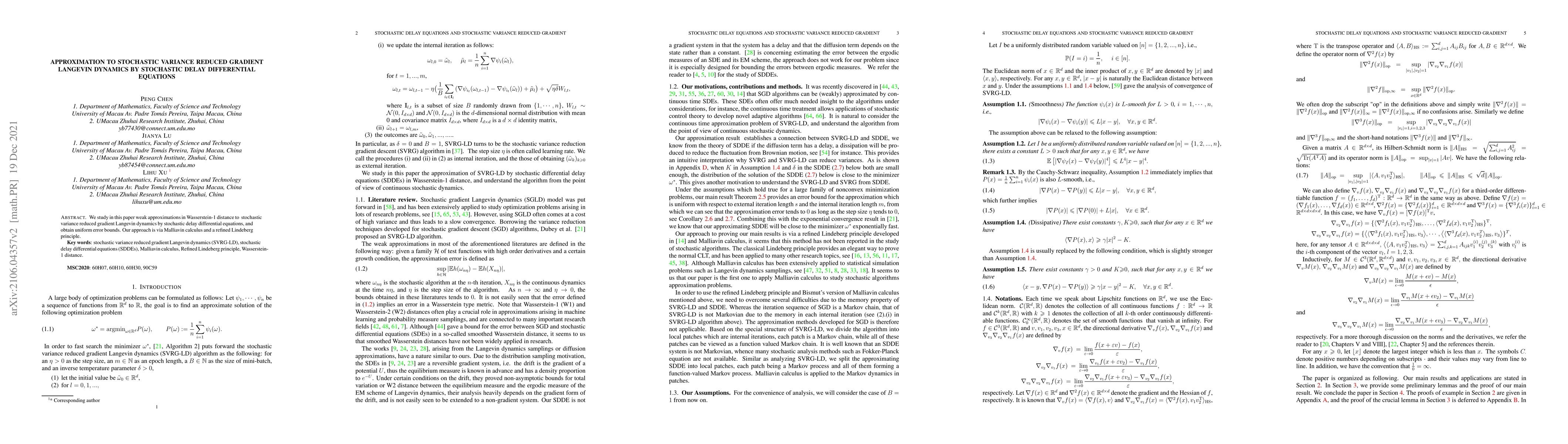 This paper investigates a weak approximation of stochastic variance reduced gradient Langevin dynamics using stochastic delay differential equations, achieving a uniform error bound through a refined Lindeberg principle and Malliavin calculus. The focus is on the Wasserstein-1 distance for convergence analysis.
