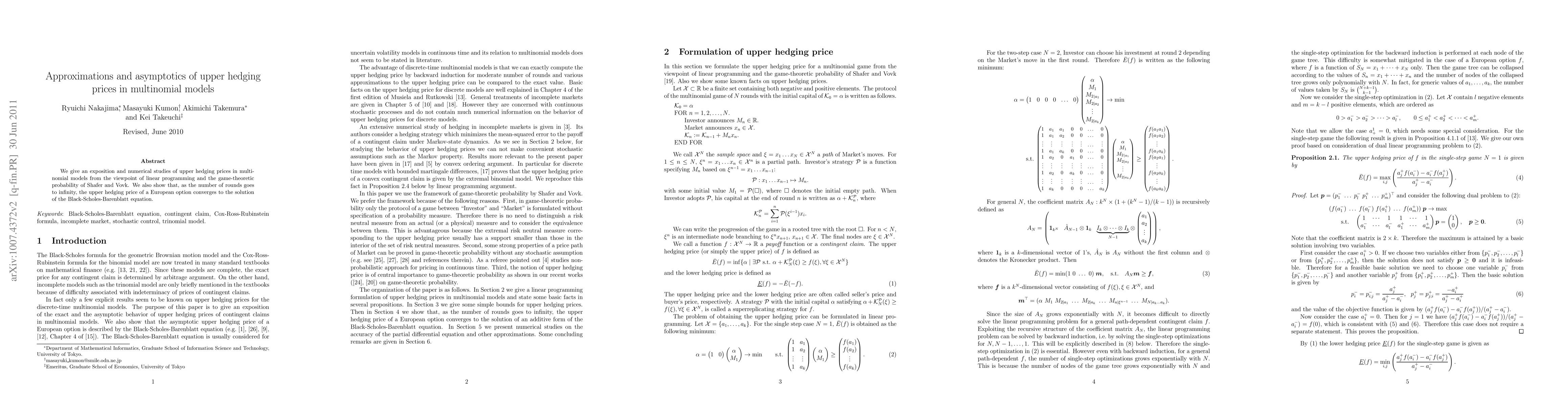 We give an exposition and numerical studies of upper hedging prices in multinomial models from the viewpoint of linear programming and the game-theoretic probability of Shafer and Vovk. We also show that, as the number of rounds goes to infinity, the upper hedging price of a European option converges to the solution of the Black-Scholes-Barenblatt equation.