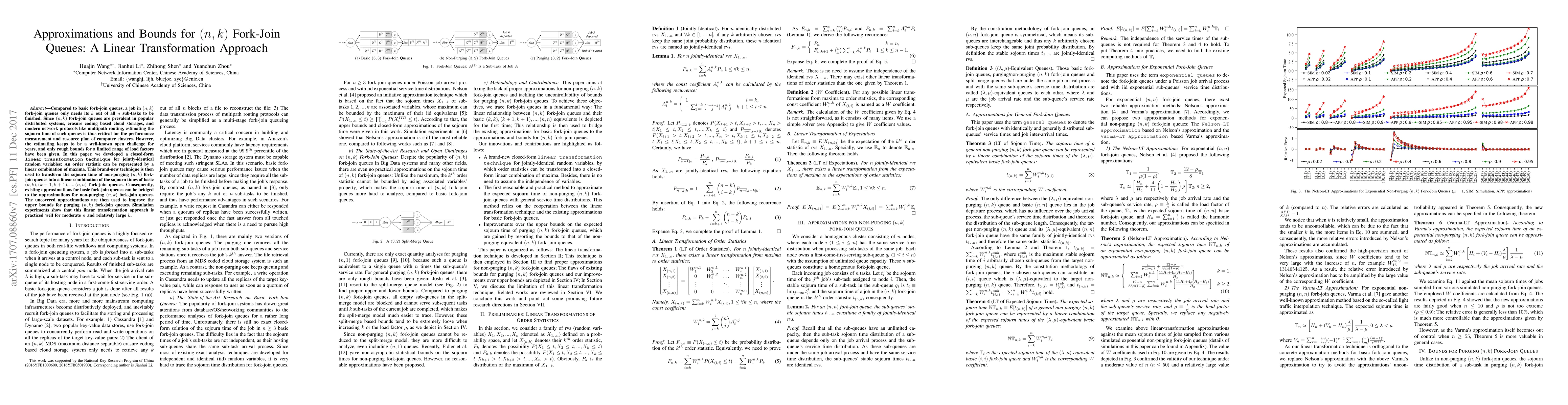 Compared to basic fork-join queues, a job in (n, k) fork-join queues only needs its k out of all n sub-tasks to be finished. Since (n, k) fork-join queues are prevalent in popular distributed systems, erasure coding based cloud storages, and modern network protocols like multipath routing, estimating the sojourn time of such queues is thus critical for the performance measurement and resource plan of computer clusters. However, the estimating keeps to be a well-known open challenge for years, and only rough bounds for a limited range of load factors have been given. In this paper, we developed a closed-form linear transformation technique for jointly-identical random variables: An order statistic can be represented by a linear combination of maxima. This brand-new technique is then used to transform the sojourn time of non-purging (n, k) fork-join queues into a linear combination of the sojourn times of basic (k, k), (k+1, k+1), ..., (n, n) fork-join queues. Consequently, existing approximations for basic fork-join queues can be bridged to the approximations for non-purging (n, k) fork-join queues. The uncovered approximations are then used to improve the upper bounds for purging (n, k) fork-join queues. Simulation experiments show that this linear transformation approach is practiced well for moderate n and relatively large k.