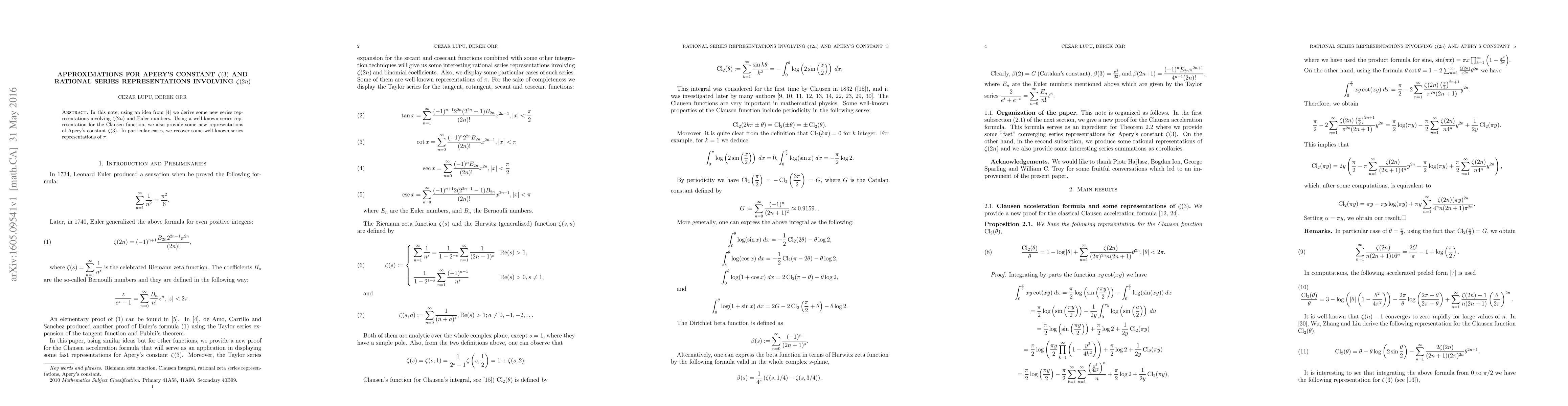 This paper derives new series representations for Apery's constant $\zeta(3)$ and rational series involving $\zeta(2n)$, employing an idea from a referenced work and connections to the Clausen function and Euler numbers. It also uncovers series representations that recover known expressions for $\pi$.