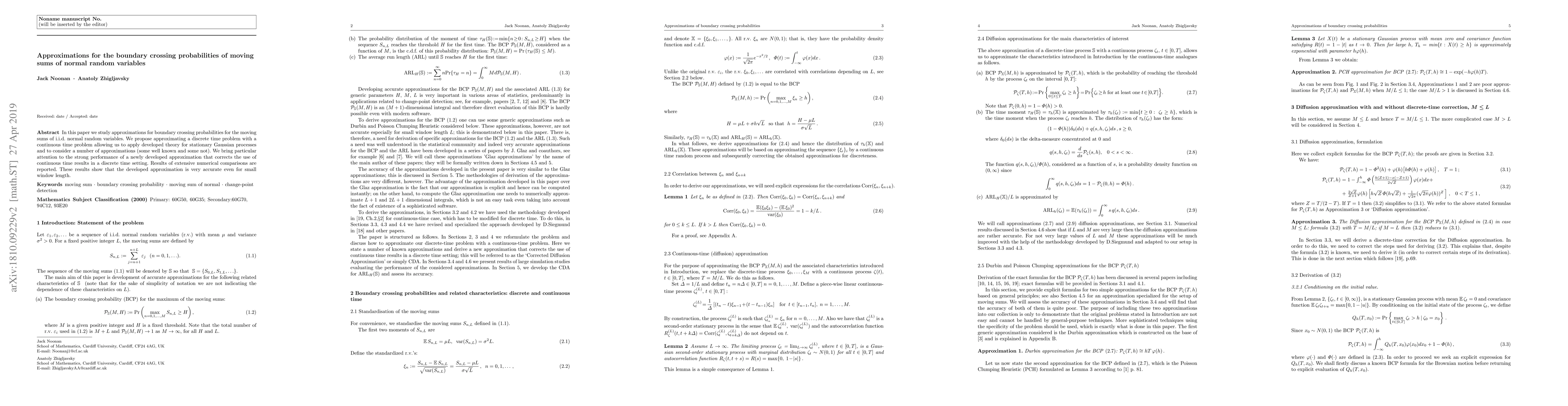 This paper proposes approximations for boundary crossing probabilities of moving sums of i.i.d. normal random variables, leveraging continuous time theory for stationary Gaussian processes. A newly developed approximation shows strong performance, especially for small window lengths, as demonstrated by extensive numerical comparisons.