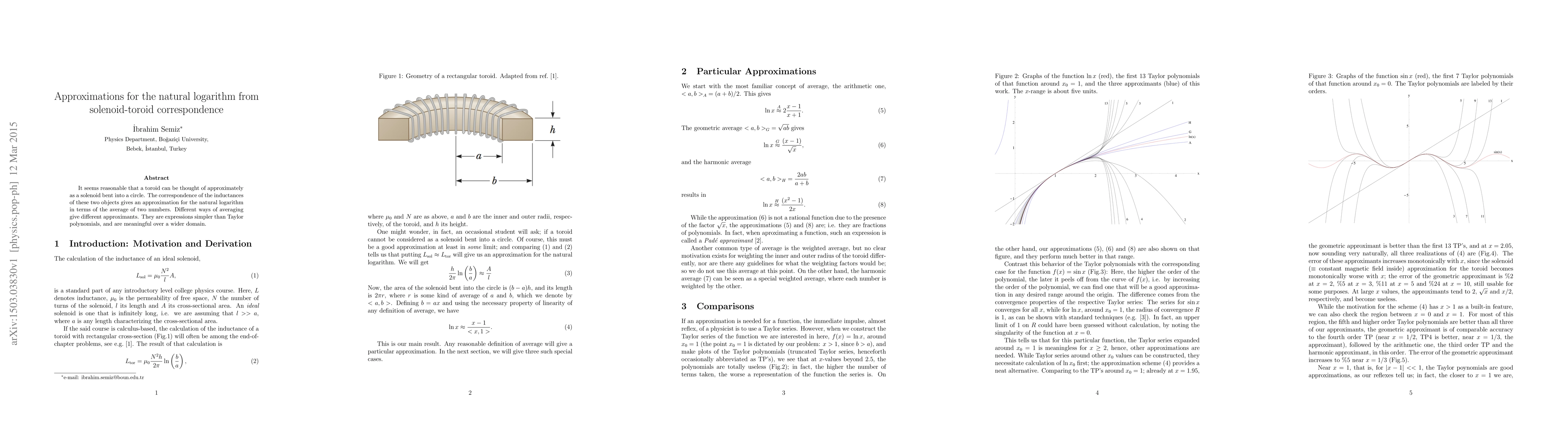 It seems reasonable that a toroid can be thought of approximately as a solenoid bent into a circle. The correspondence of the inductances of these two objects gives an approximation for the natural logarithm in terms of the average of two numbers. Different ways of averaging give different approximants. They are expressions simpler than Taylor polynomials, and are meaningful over a wider domain.