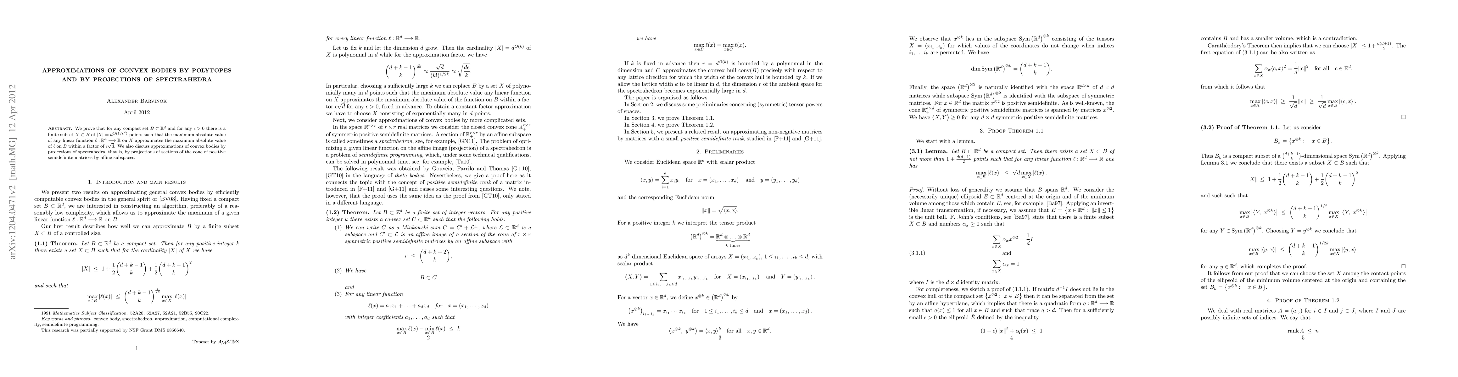 This paper proves that any compact set in R^d can be approximated by a finite subset of size d^{O(1/epsilon^2)} that closely estimates the maximum absolute value of linear functions on the set within a factor of epsilon sqrt{d}. It also explores approximating convex bodies via projections of spectrahedra, which are sections of positive semidefinite matrix cones.