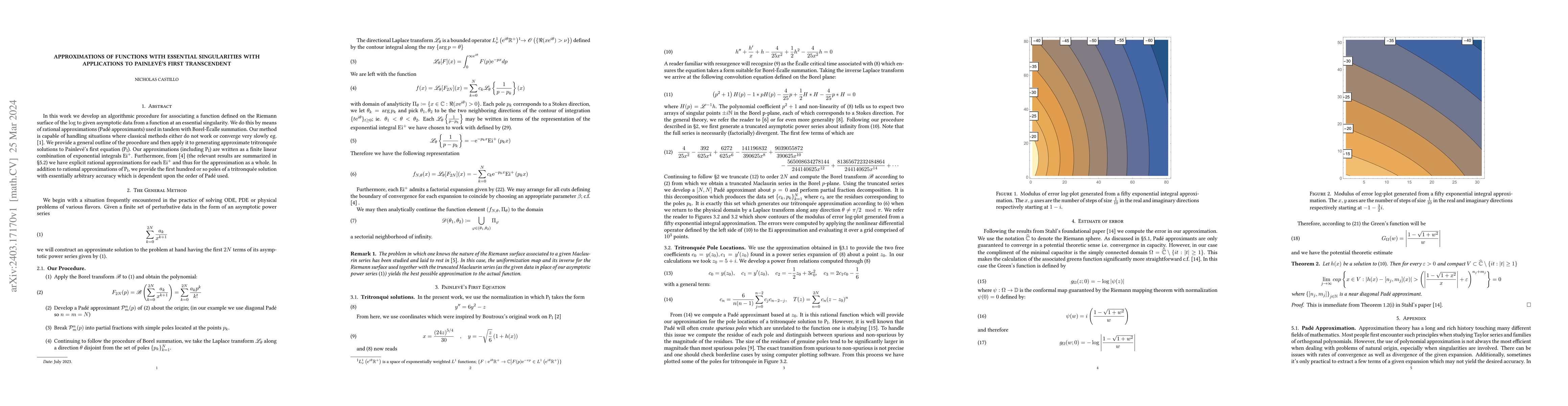 In this work we develop an algorithmic procedure for associating a function defined on the Riemann surface of the $\log$ to given asymptotic data from a function at an essential singularity. We do this by means of rational approximations (Pad\'e approximants) used in tandem with Borel-\'Ecalle summation. Our method is capable of handling situations where classical methods either do not work or converge very slowly eg. \cite{DunLutz}. We provide a general outline of the procedure and then apply it to generating approximate tritronqu\'ee solutions to Painlev\'e's first equation ($\text{P}_\text{I}$). Our approximations (including $\text{P}_\text{I}$) are written as a finite linear combination of exponential integrals $\text{Ei}^+$. Furthermore, from arXiv:2210.17502 we have explicit rational approximations for each $\text{Ei}^+$ and thus for the approximation as a whole. In addition to rational approximations of $\text{P}_\text{I}$, we provide the first hundred or so poles of a tritronqu\'ee solution with essentially arbitrary accuracy which is dependent upon the order of Pad\'e used.