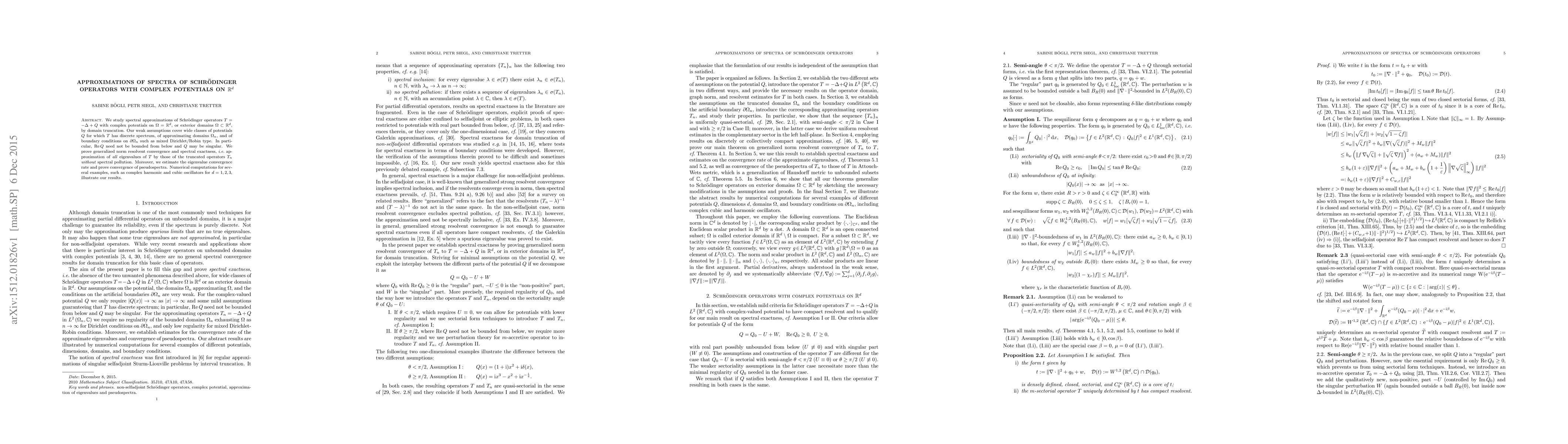This paper investigates spectral approximations of Schrödinger operators with complex potentials via domain truncation, proving generalized norm resolvent convergence and spectral exactness without spectral pollution. It covers a broad range of potentials, approximating domains, and boundary conditions, and includes numerical examples to illustrate the theoretical results.