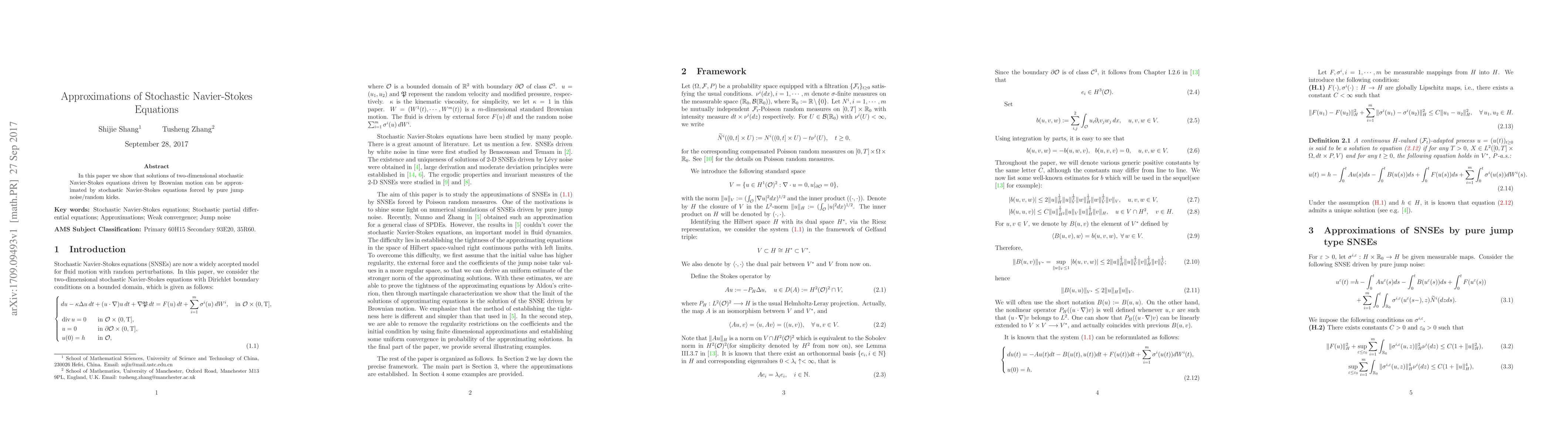 Summary: This research demonstrates that solutions to two-dimensional stochastic Navier-Stokes equations influenced by Brownian motion can be closely approximated by those driven by pure jump noise or random kicks. The study provides a method for simplifying complex stochastic fluid dynamics models.