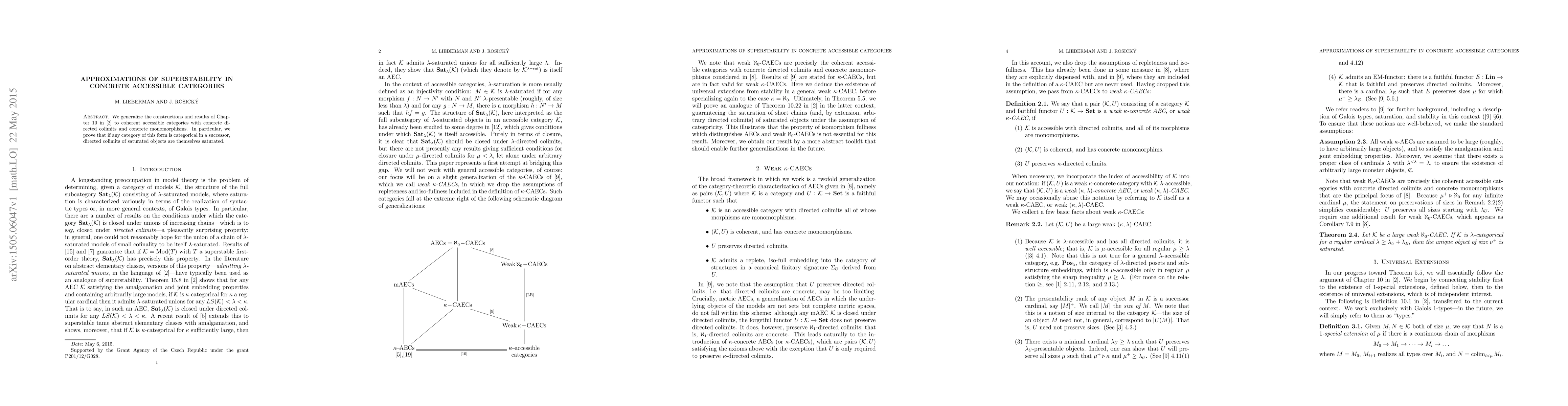 This paper generalizes Baldwin's results on categoricity to coherent accessible categories with concrete directed colimits and monomorphisms, proving that directed colimits of saturated objects in such categories remain saturated. The focus is on approximations of superstability within these structures.