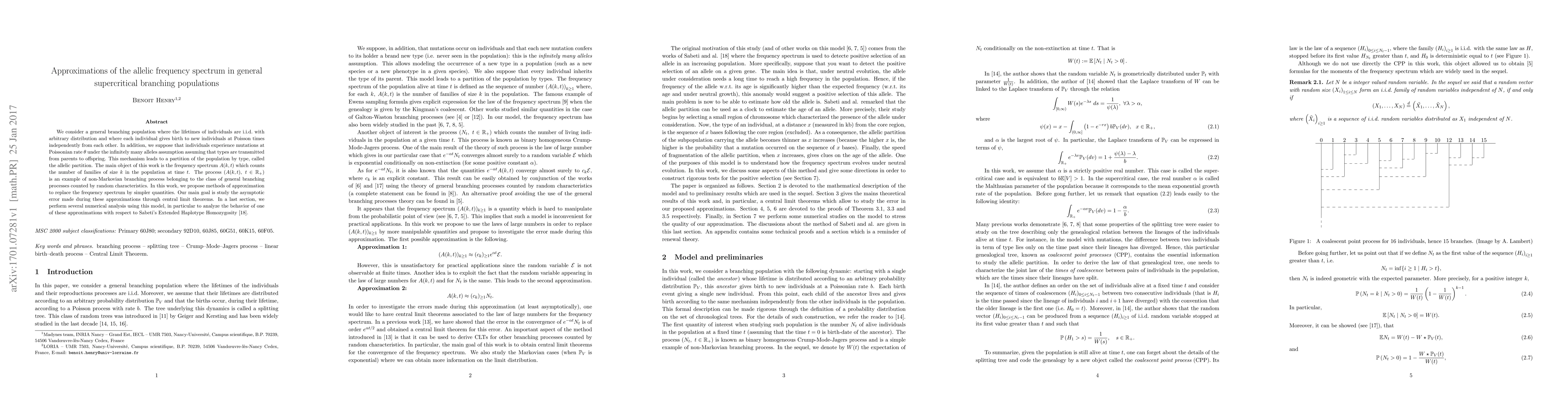 We consider a general branching population where the lifetimes of individuals are i.i.d.\ with arbitrary distribution and where each individual gives birth to new individuals at Poisson times independently from each other. In addition, we suppose that individuals experience mutations at Poissonian rate $\theta$ under the infinitely many alleles assumption assuming that types are transmitted from parents to offspring. This mechanism leads to a partition of the population by type, called the allelic partition. The main object of this work is the frequency spectrum $A(k,t)$ which counts the number of families of size $k$ in the population at time $t$. The process $(A(k,t),\ t\in\mathbb{R}_+)$ is an example of non-Markovian branching process belonging to the class of general branching processes counted by random characteristics. In this work, we propose methods of approximation to replace the frequency spectrum by simpler quantities. Our main goal is study the asymptotic error made during these approximations through central limit theorems. In a last section, we perform several numerical analysis using this model, in particular to analyze the behavior of one of these approximations with respect to Sabeti's Extended Haplotype Homozygosity [18].