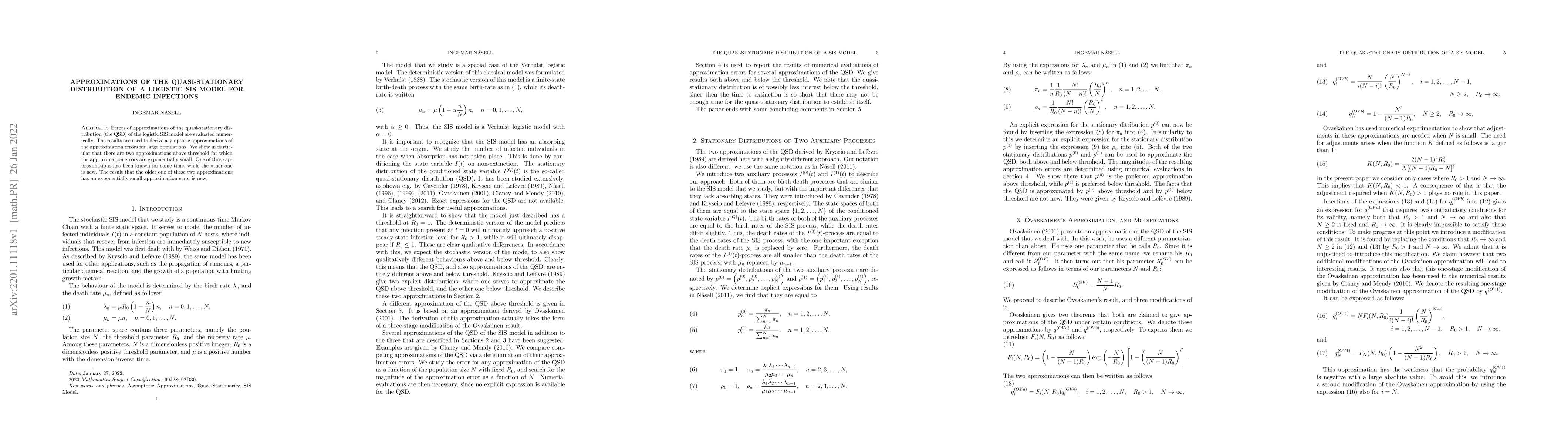 Researchers evaluated approximations of the quasi-stationary distribution for a model of endemic infections and found two approximations with exponentially small errors, one of which is new and previously unknown to be exponentially accurate.