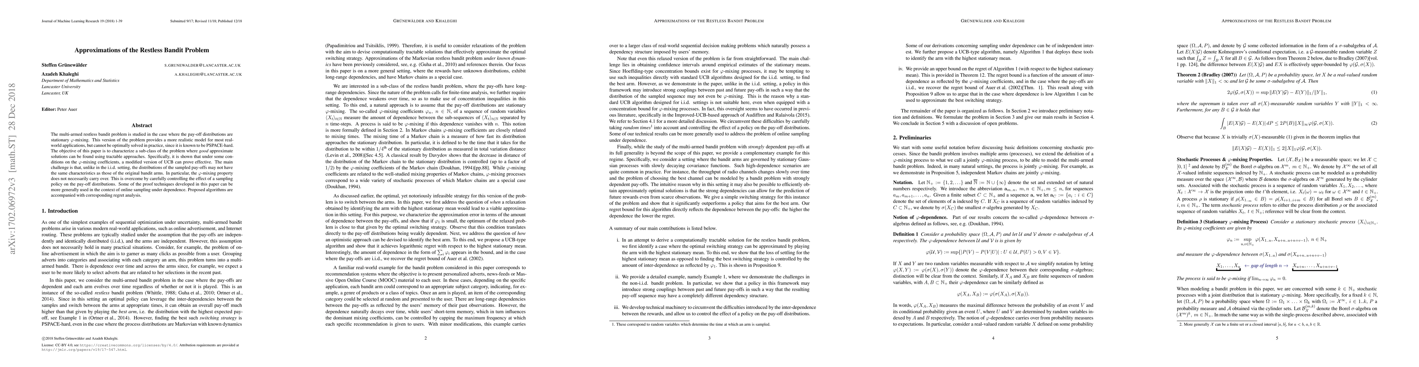 The multi-armed restless bandit problem is studied in the case where the pay-off distributions are stationary $\varphi$-mixing. This version of the problem provides a more realistic model for most real-world applications, but cannot be optimally solved in practice, since it is known to be PSPACE-hard. The objective of this paper is to characterize a sub-class of the problem where {\em good} approximate solutions can be found using tractable approaches. Specifically, it is shown that under some conditions on the $\varphi$-mixing coefficients, a modified version of UCB can prove effective. The main challenge is that, unlike in the i.i.d. setting, the distributions of the sampled pay-offs may not have the same characteristics as those of the original bandit arms. In particular, the $\varphi$-mixing property does not necessarily carry over. This is overcome by carefully controlling the effect of a sampling policy on the pay-off distributions. Some of the proof techniques developed in this paper can be more generally used in the context of online sampling under dependence. Proposed algorithms are accompanied with corresponding regret analysis.
