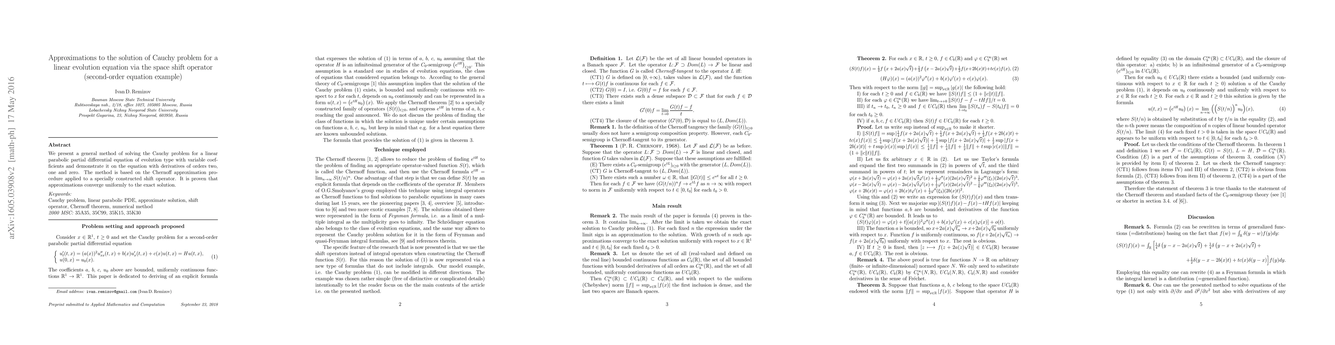 We present a general method of solving the Cauchy problem for a linear parabolic partial differential equation of evolution type with variable coefficients and demonstrate it on the equation with derivatives of orders two, one and zero. The method is based on the Chernoff approximation procedure applied to a specially constructed shift operator. It is proven that approximations converge uniformly to the exact solution.