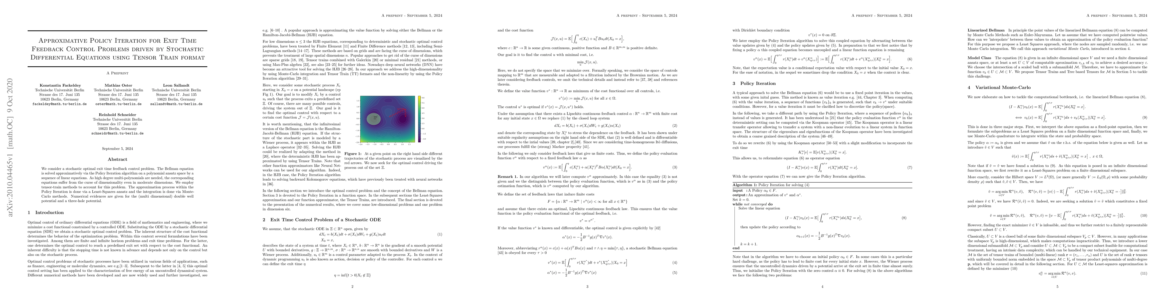 This paper proposes an approximative Policy Iteration method for solving stochastic optimal exit time control problems driven by Stochastic Differential Equations. The curse of dimensionality is addressed using tensor-train methods to efficiently handle high-degree multi-polynomials, with numerical results demonstrated for double well and three-hole potentials.
