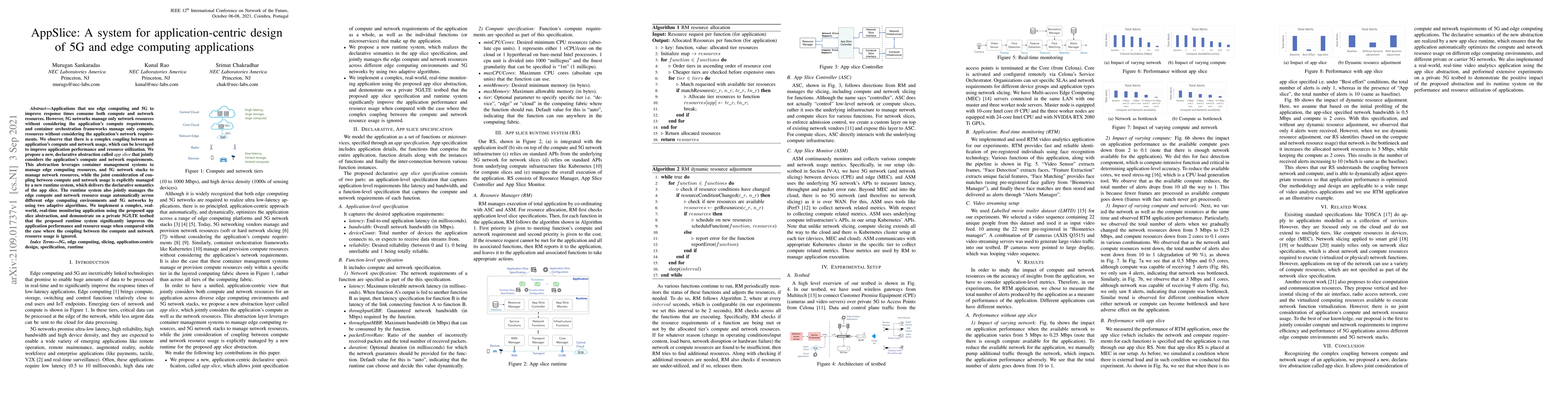 The AppSlice system proposes a new abstraction to jointly manage compute and network resources for 5G and edge computing applications, significantly improving performance and resource utilization through adaptive algorithms. The runtime system manages the coupling between compute and network usage, demonstrating substantial gains in a real-world application on a private 5G/LTE network.