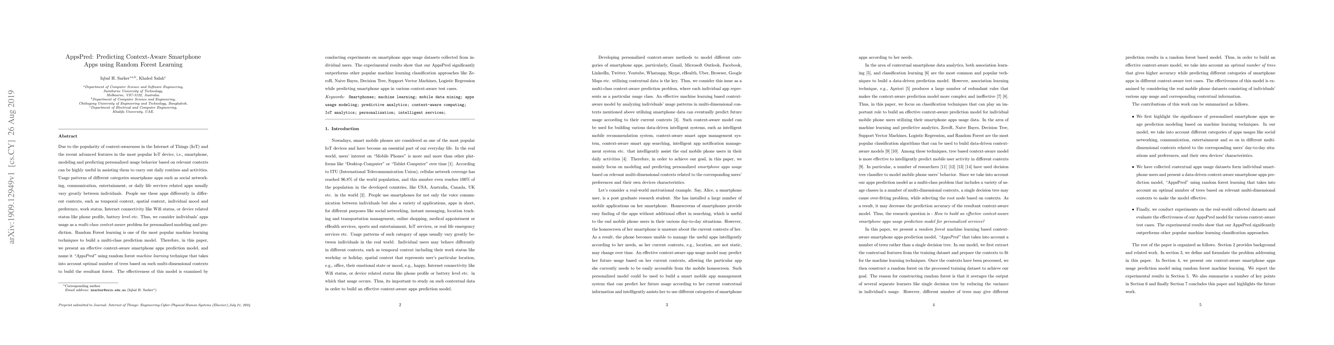 AppsPred leverages Random Forest learning to predict context-aware smartphone app usage based on multi-dimensional contexts, significantly outperforming other machine learning methods in experiments. The model's effectiveness is validated through comprehensive testing on real-world usage data.
