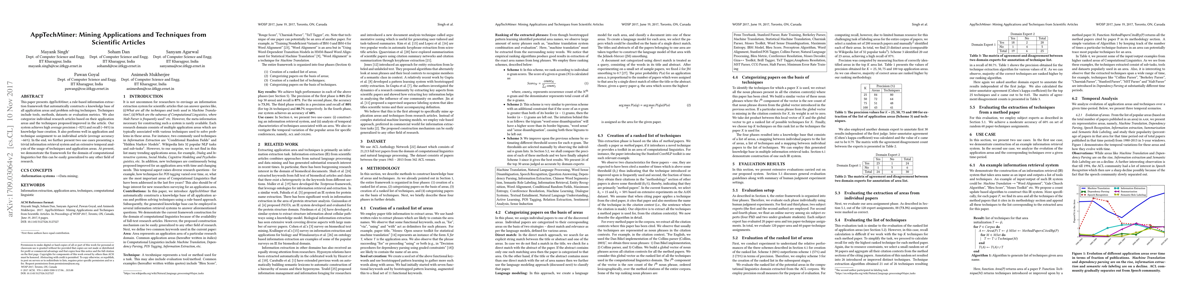 A new system called AppTechMiner automatically extracts application areas and problem-solving techniques from scientific articles with high precision and recall rates.