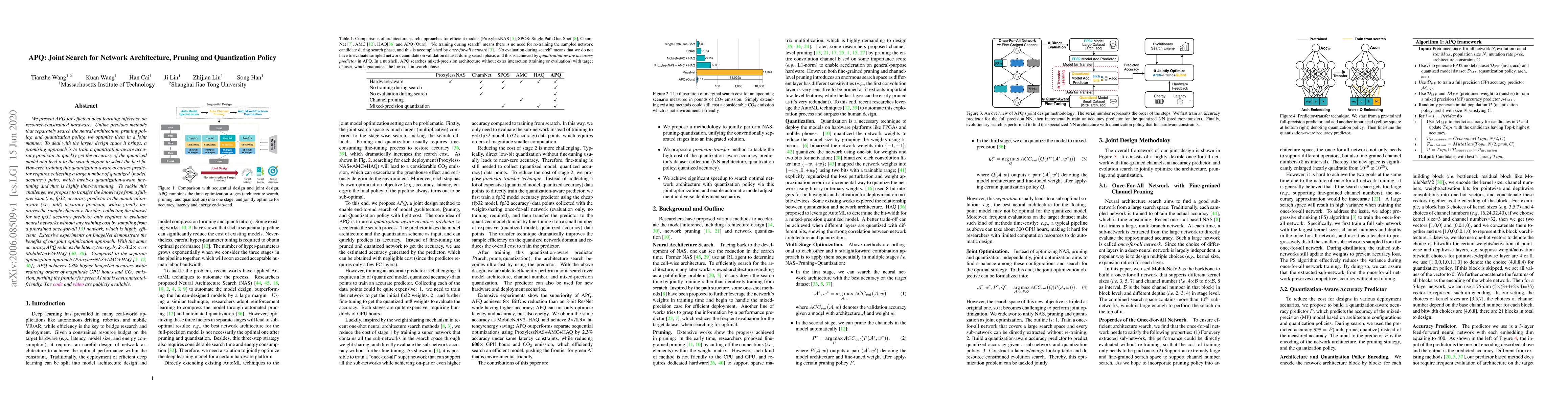 APQ optimizes neural architecture, pruning, and quantization jointly for efficient deep learning on constrained hardware, leveraging knowledge transfer to improve sample efficiency. Experiments show APQ reduces latency/energy by 2x/1.3x over MobileNetV2+HAQ and achieves 2.3% higher ImageNet accuracy while minimizing resource use.