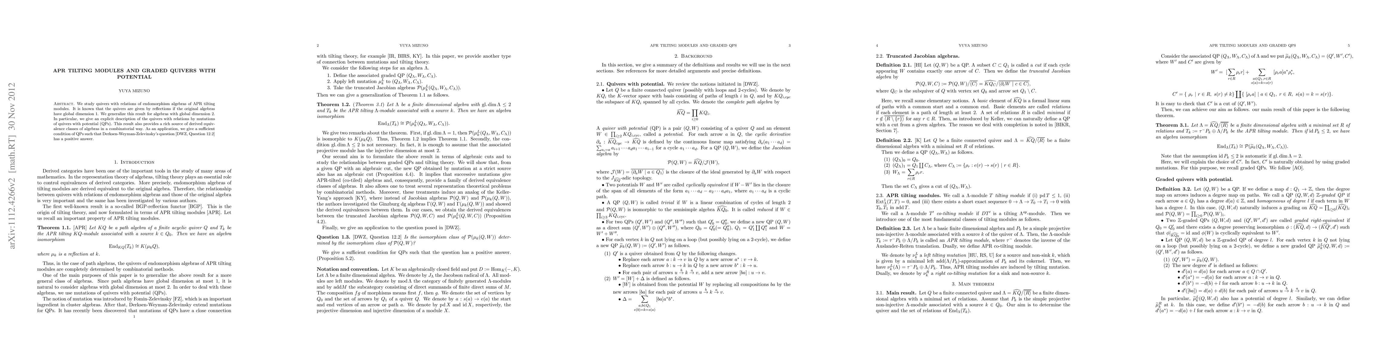 This paper explores the endomorphism algebra of an APR tilting module via quivers with relations and graded quivers with potential (QPs), demonstrating how QP mutations induce tilting mutations in associated truncated Jacobian algebras. It also provides a condition under which Derksen-Weyman-Zelevinsky's question about derived equivalence classes of algebras has a positive answer.
